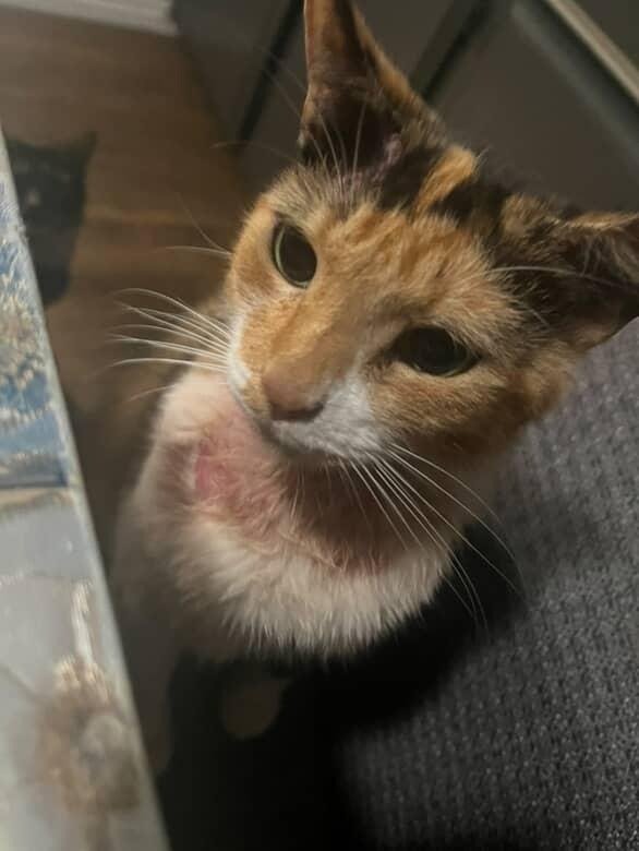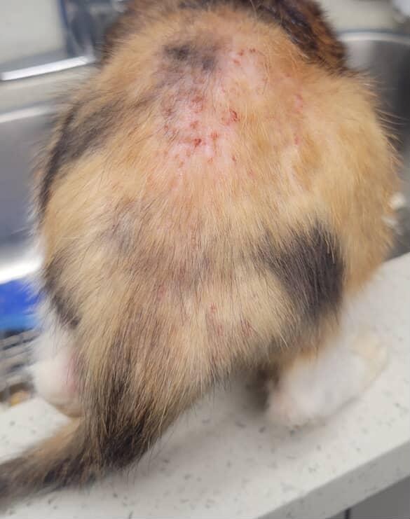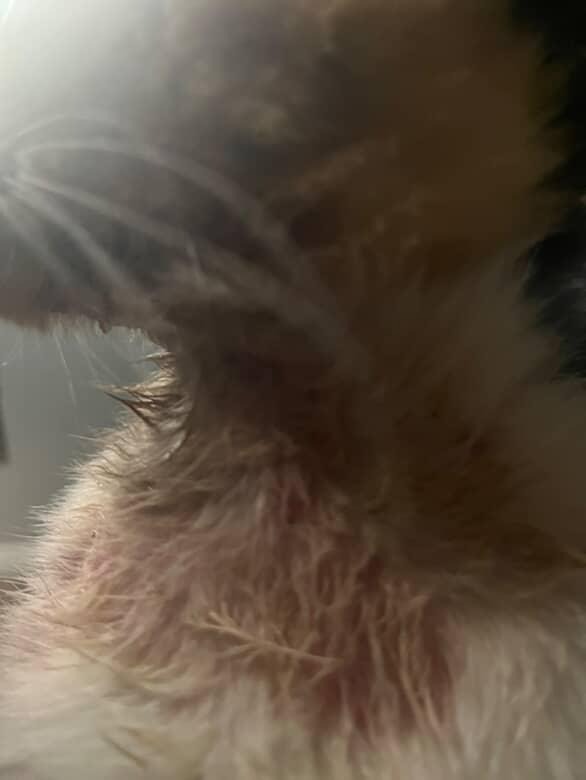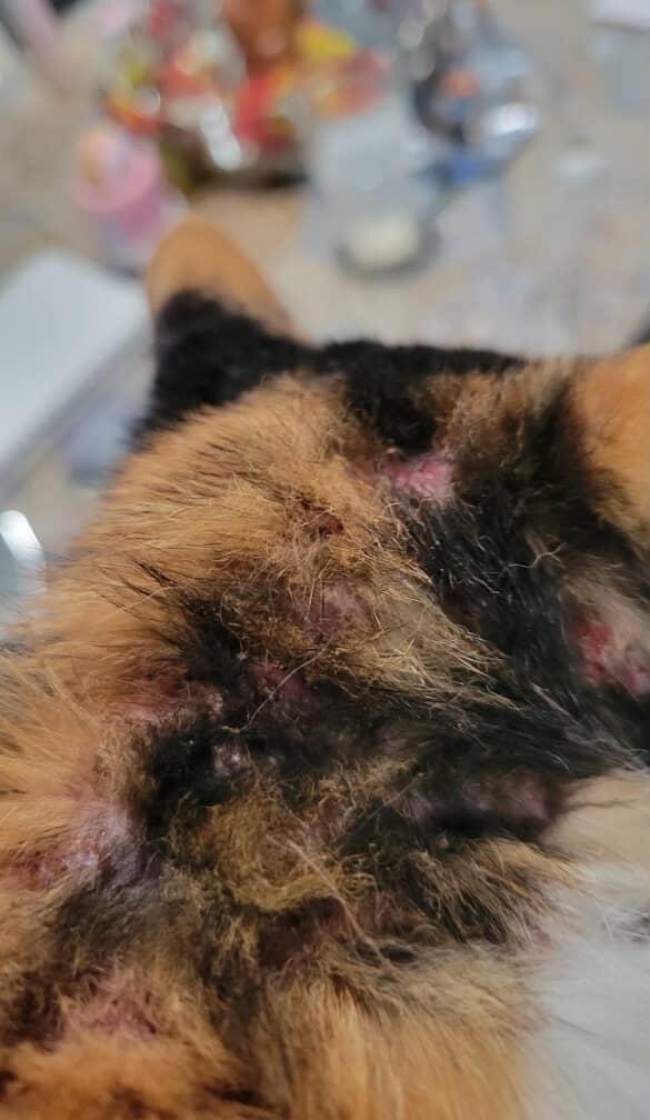 On the back of her neck, there are spots everywhere that are scabbing, bumps, and bleeding. Below her neck, there is a huge red rash that seems to be getting bigger. Near her tail, there are little red bumps that are not bleeding, but she constantly bites them. I can tell that she is in discomfort and is constantly scratching and licking those area. It seems to be getting worse, and I don’t want to wait until she gets horrible symptoms to do something about it. If anyone knows what it might be, reach out to me. I want to get her the care she needs. Please help our beautiful baby girl.