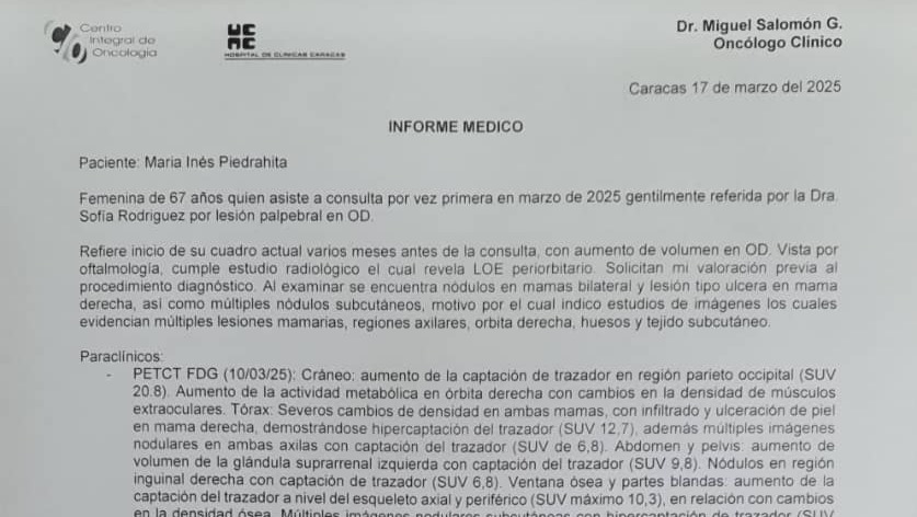 Hace unas semanas, recibimos la devastadora noticia: a mamá le diagnosticaron un adenocarcinoma de mama bilateral metastásico. Clínicamente, presenta un tumor ulcerado y sangrante en la mama derecha, y múltiples nódulos en ambas mamas y axilas, metástasis que le ha vulnerado el cráneo y comprometido otros huesos del cuerpo.