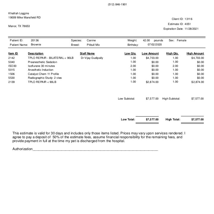 She will be treated at FM 685 Animal Hospital in Hutto, Tx  [phone redacted]