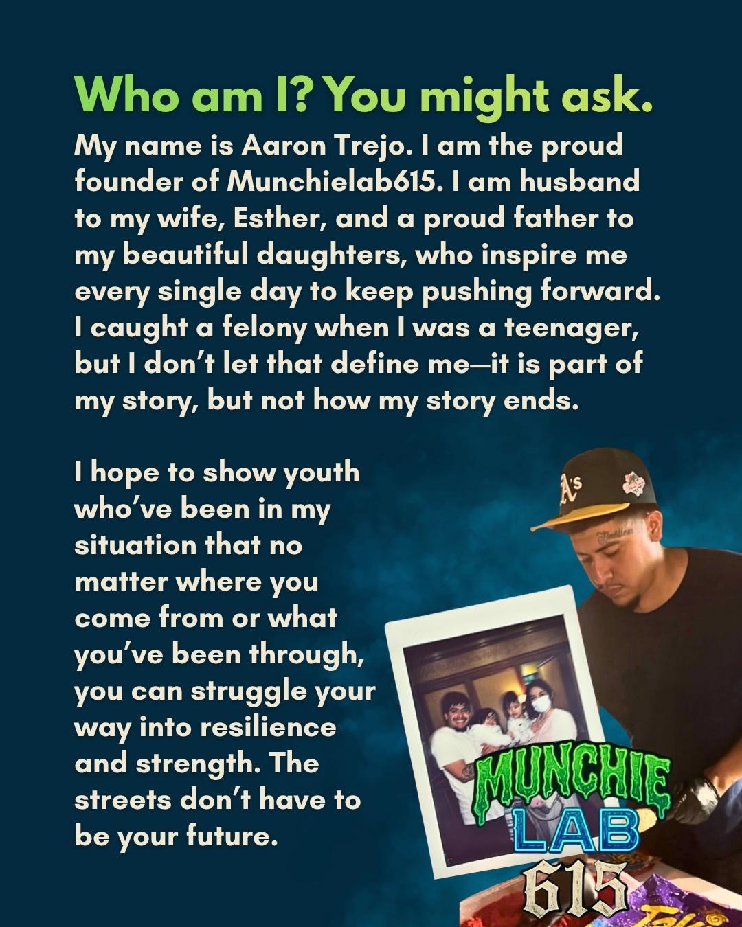 Who am I? you might ask. My name is Aaron Trejo, and I am the proud founder of Munchielab615. I am husband to my wife Esther Alejandra and a proud father to my beautiful daughters who inspire me every single day to keep pushing forward. I got a felony when I was a teenager, but I don’t let that define me—it is part of my story but not how my story ends. I hope to show youth that are finding themselves or have found themselves in that situation that no matter where you come from or what you’ve been through, you can struggle your way into resilience and strength. The streets don’t have to be your future.
