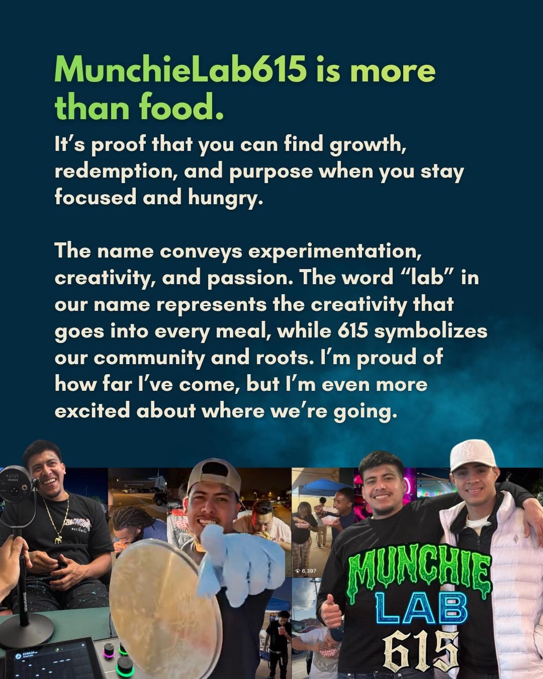 MunchieLab615 is more than food. It’s proof that you can find growth, redemption and purpose when you stay focused and hungry. The name represents experimentation, creativity and passion. The word “lab” in our name stands for the creativity that goes into every meal, while 615 represents our community and roots. I’m proud of how far I’ve come but I’m even more excited of where we’re going. MunchieLab isn’t just my business; it’s my legacy.