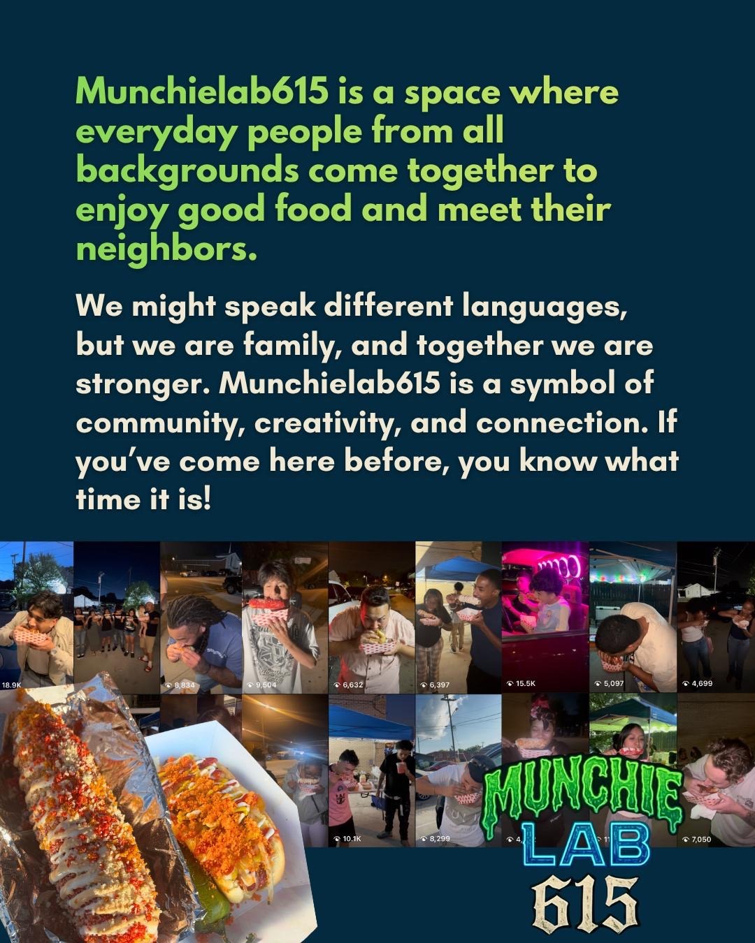 Munchielab615 is a space where everyday people from all backgrounds come together to enjoy good food and meet their neighbors. We might speak different languages, but we are family, and together we are stronger. Munchielab615 is a symbol of community, creativity and connection. If you’ve come here before you what time it is!