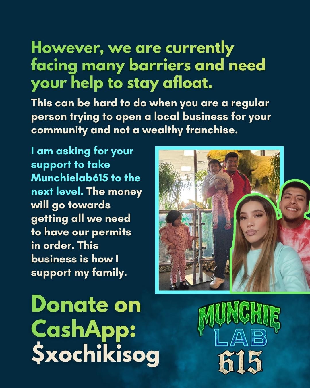 However, we are currently facing many barriers and need your help to stay afloat. This can be hard to do when you are a regular person trying to open a local business for your community and not a wealthy franchise. I am asking for your support to take Munchielab615 to the next level. The money will go towards getting all we need to have our permits in order. This business is how I support my family. Every donation, big or small, goes towards keeping this dream alive.