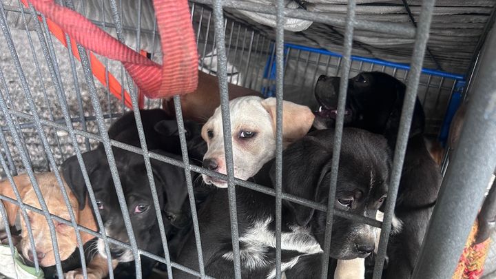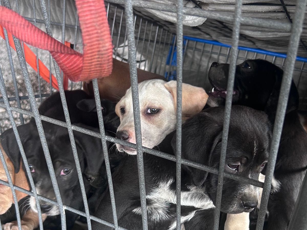 Sweet mom & nine puppies RESCUED from horrific conditions, already on their way to a much better life, literally overnight. Because of kind, caring people with open hearts, they've transitioned from inhumane conditions to a secure environment with food, water, a calm, safe place to sleep, space to play & grass to walk on. Previously, spending day & night in an overcrowded metal grocery cart, mom on concrete under a noisy overpass, in a dangerous metropolitan area.