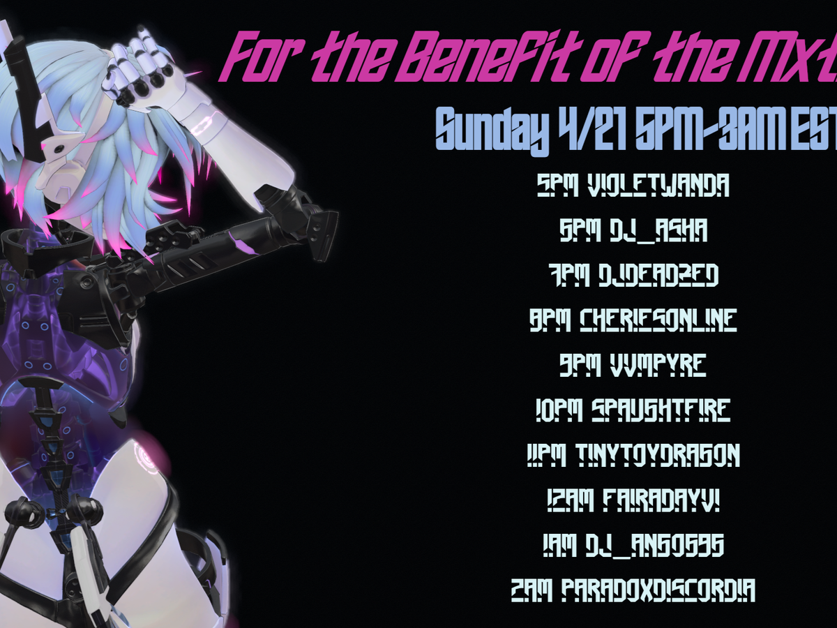 MxtressMyxx has been a huge source of inspiration for many in her community to create and improve themselves and their craft (whether that be avatar creation, streaming, dancing, DJing, music production, etc). Presently, she is undergoing a precarious financial situation in her life. Because of this, BLOO-D of VVMPYRE, Tiny Toy Dragon, and myself, with cooperation of her best friend, have decided to put on a benefit event on Twitch, featuring DJs and members of the VRChat community to raise some money and buy her some time.