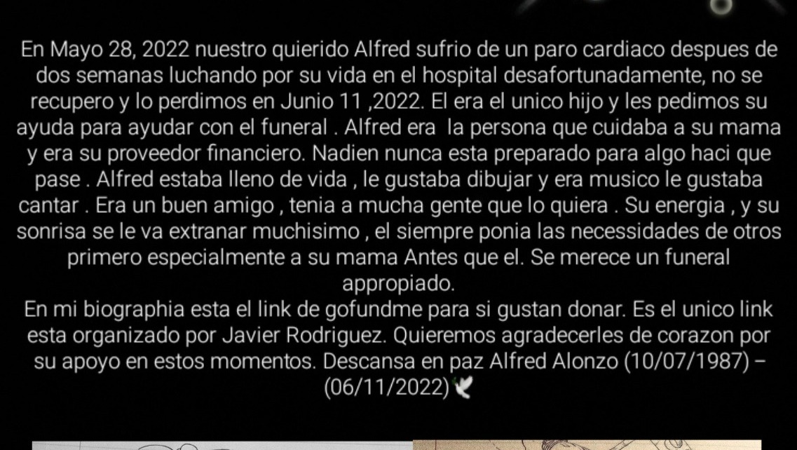 On May, 28 2022 Our Beloved Alfred suffered a cardiac arrest after two weeks of fighting for his life in the hospital unfortunately, he did not recover and we lost him on June, 11 2022. He is an only son and we ask for your help in any way for his funeral expenses to assist his mother and take some stress off her shoulders . Alfred was his mom's primary care and financial provider. No one is ever prepared for anything like this.