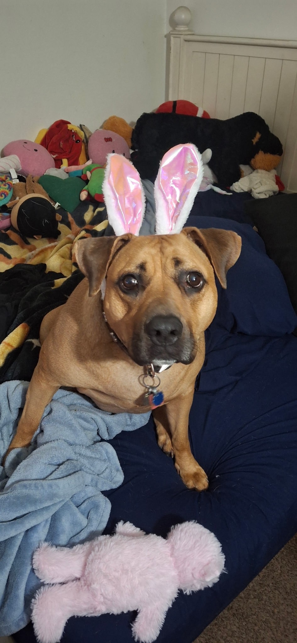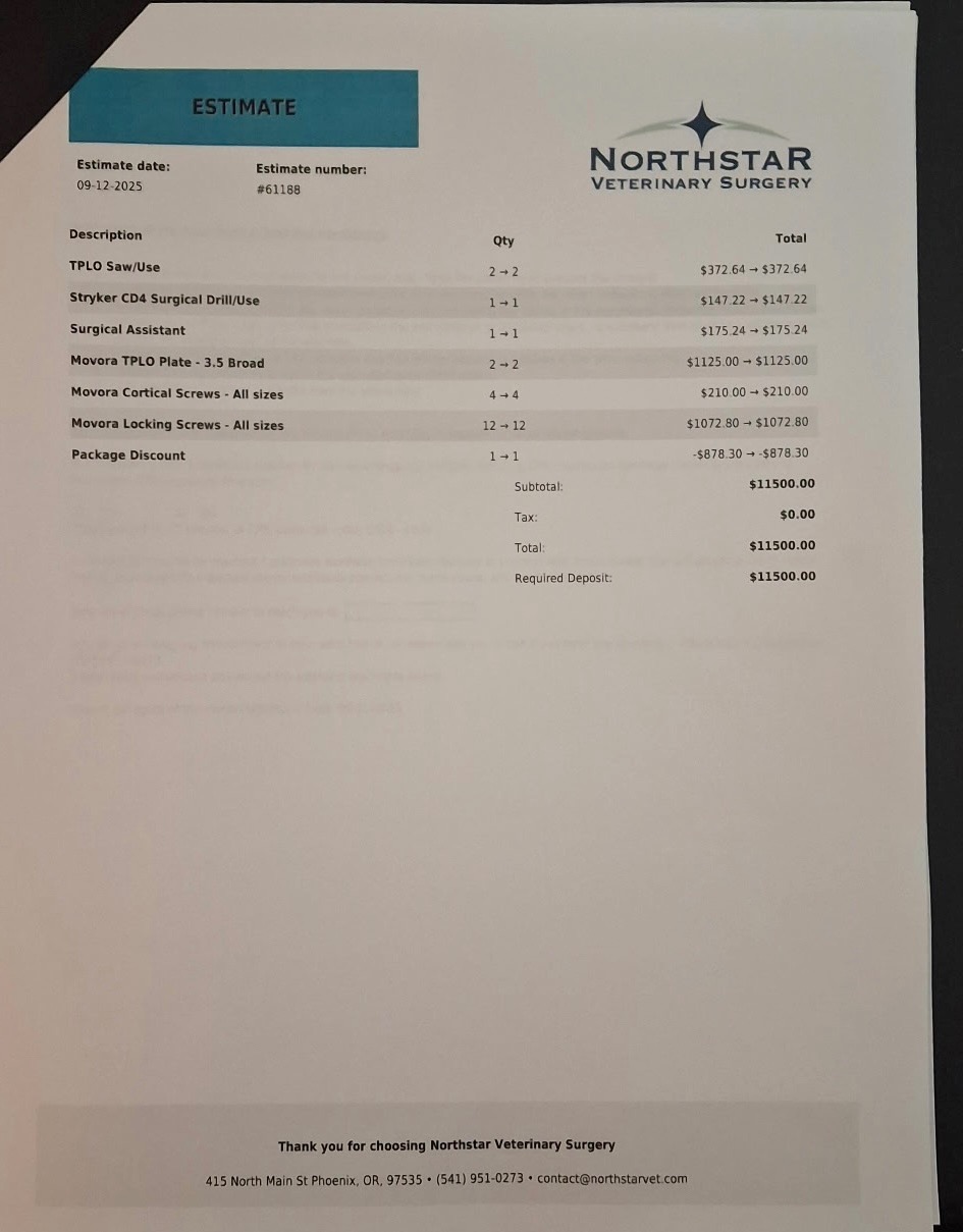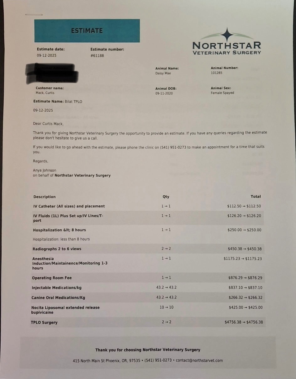 This is my Daisy Mae. She just turned 5 years old on 9/11/2025. Just recently she started having issues with her hind quarters. She just started collapsing and crying out in pain. She has had three visits to the vet with the last one getting X rays under sedation. She then was referred to the surgeon where she had her appointment on 9/12/2025. Daisy Mae has been diagnosed with what is called bilateral cranial cruciate ligament ruptures, and she will be needing surgery on both of her knees. Daisy is just the sweetest girl and it's heart breaking to see her in so much pain. She is currently prescribed 100mg Carprofen twice daily, Gabapentin 300mg twice daily, Tramadol 1 1/2 50mg every 8 to 12 hrs and Methocarbamol 1 1/4 every 8 to 12hrs. In the process of getting a support harness to help her walk. She is a doctor prescribed comfort dog. Please consider helping out, even the smallest of donations mean so much.