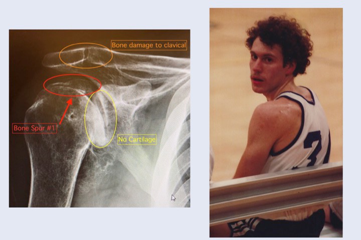 I had continuously landed on my right elbow as I hit the hardwood floor and unknown to me that blow always transferred up and into my right shoulder (at that time I saw myself as right handed), creating a wearing away of the cartilage there. I continued that tradition of landing on or overusing my shoulder through all my other sports & work activities: martial arts, cycling, softball, volleyball, yoga, farming, gardening, construction, etc.