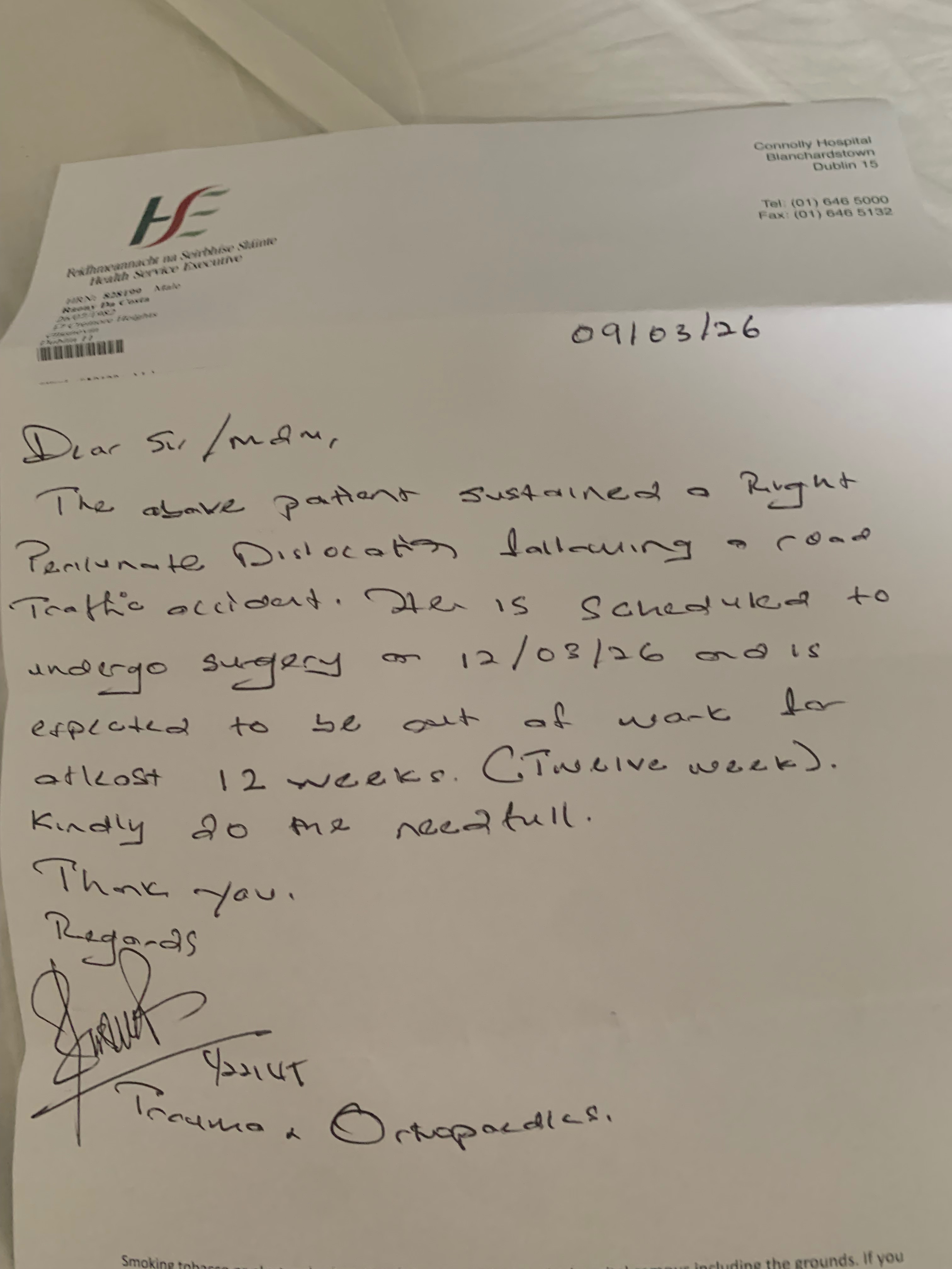 I spent three days at the hospital in pain, uncertainty, and emotional distress, waiting for a solution. After those days, the medical team concluded that they did not have a specialist hand surgeon available to perform the surgery my injury required. Because of that, I was transferred to Connolly Hospital, where I finally underwent surgery on March 12th, 2026.