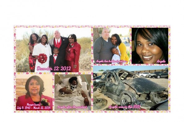 On March 15, 2014, Angela, her mother, her young son, her cousin (Tijuana) and two teenage cousins were traveling to California from Arizona. High winds overtook the vehicle and it went hurtling off the highway, rolling several times. When emergency crews arrived, they immediately attended to Angela's son and her cousins. Unfortunately, her mother did not survive the crash. In one of God's miracles, Angela remembers her mother's voice saying, "Get up. It's not your time." Taking a miraculous breath, Angela sat up and crews immediately rushed to her side. She held on to consciousness long enough to comfort her terrified son, who was being loaded to a nearby helicopter. When he lifted off, she slipped back into a fog and they rushed to medevac her as well. Angela and her son were air lifted to separate hospitals. Thankfully, her son and cousins are on the road to full recoveries.