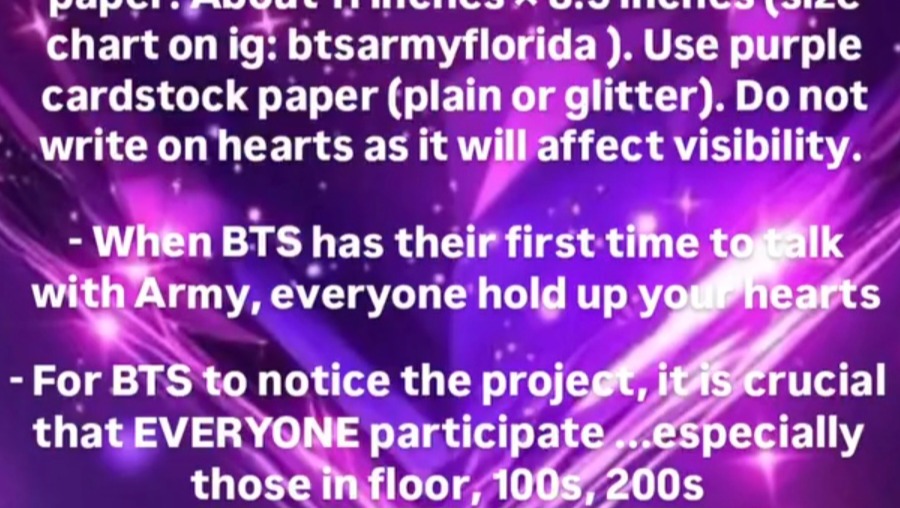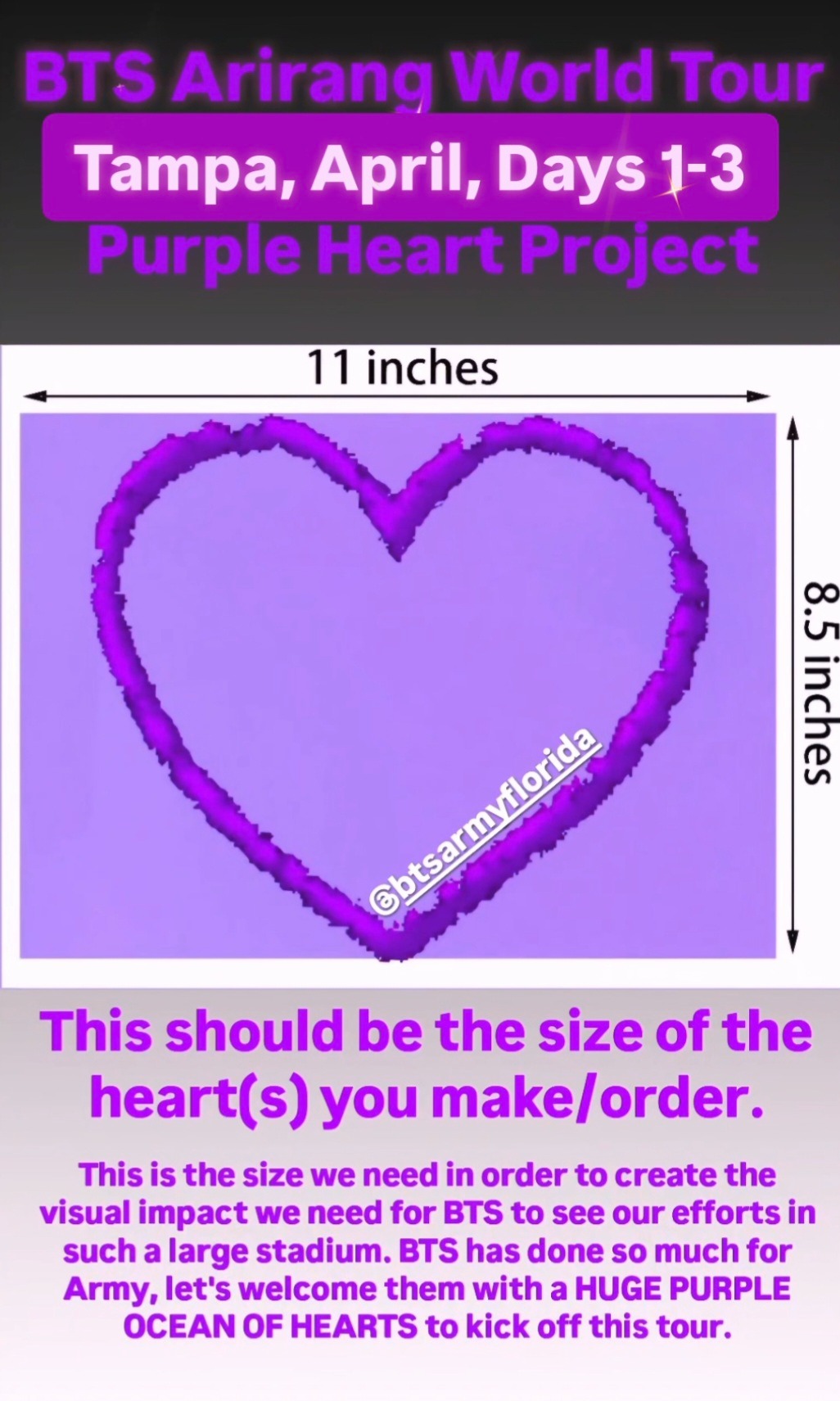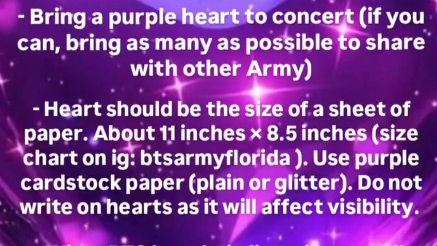 -You can buy Purple Cardstock paper and cut out as many hearts as possible and bring them to the concert day(s) you are attending in Tampa. *Please note: Size chart on Instagram (roughly 11in×8.5in). Do not write on the hearts as it will affect visibility. Plain purple cardstock or purple glitter cardstock. All shades of PURPLE.