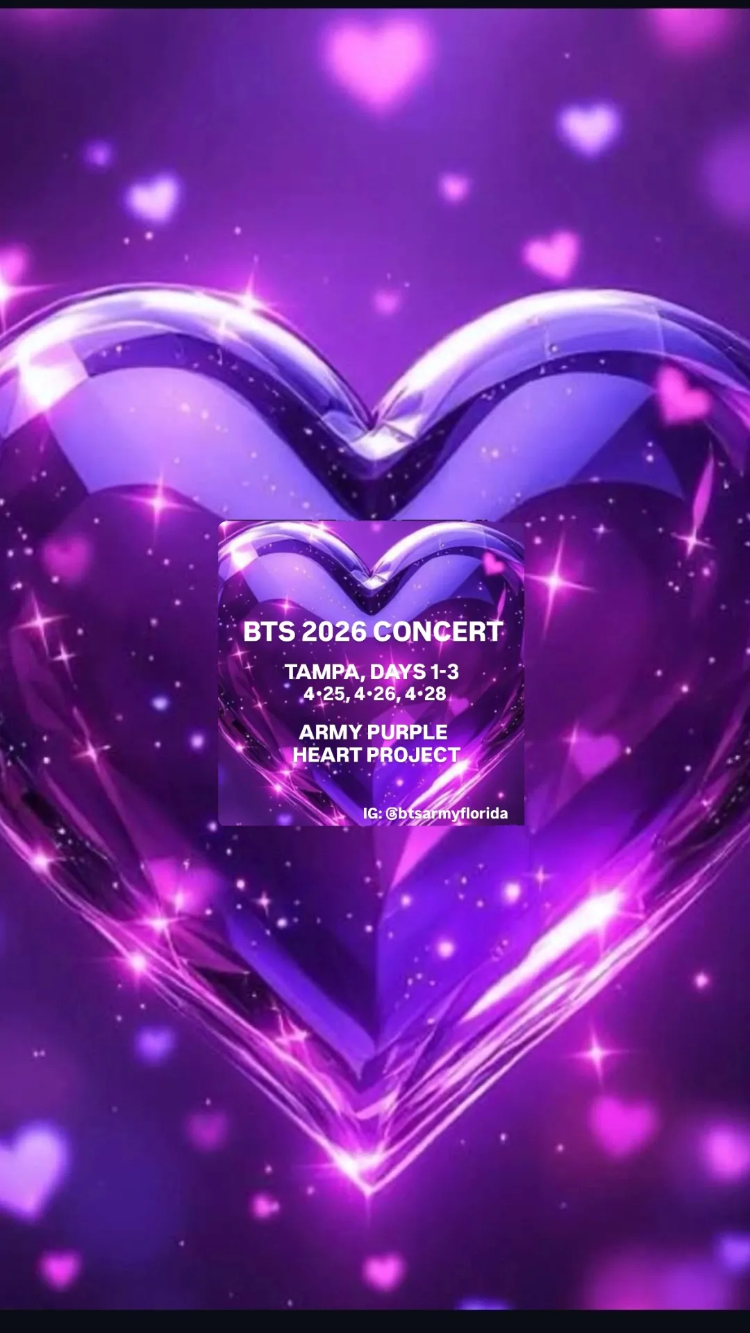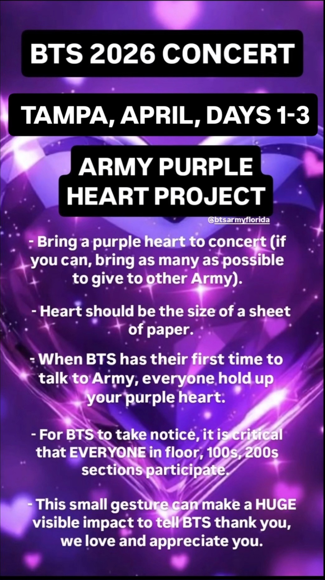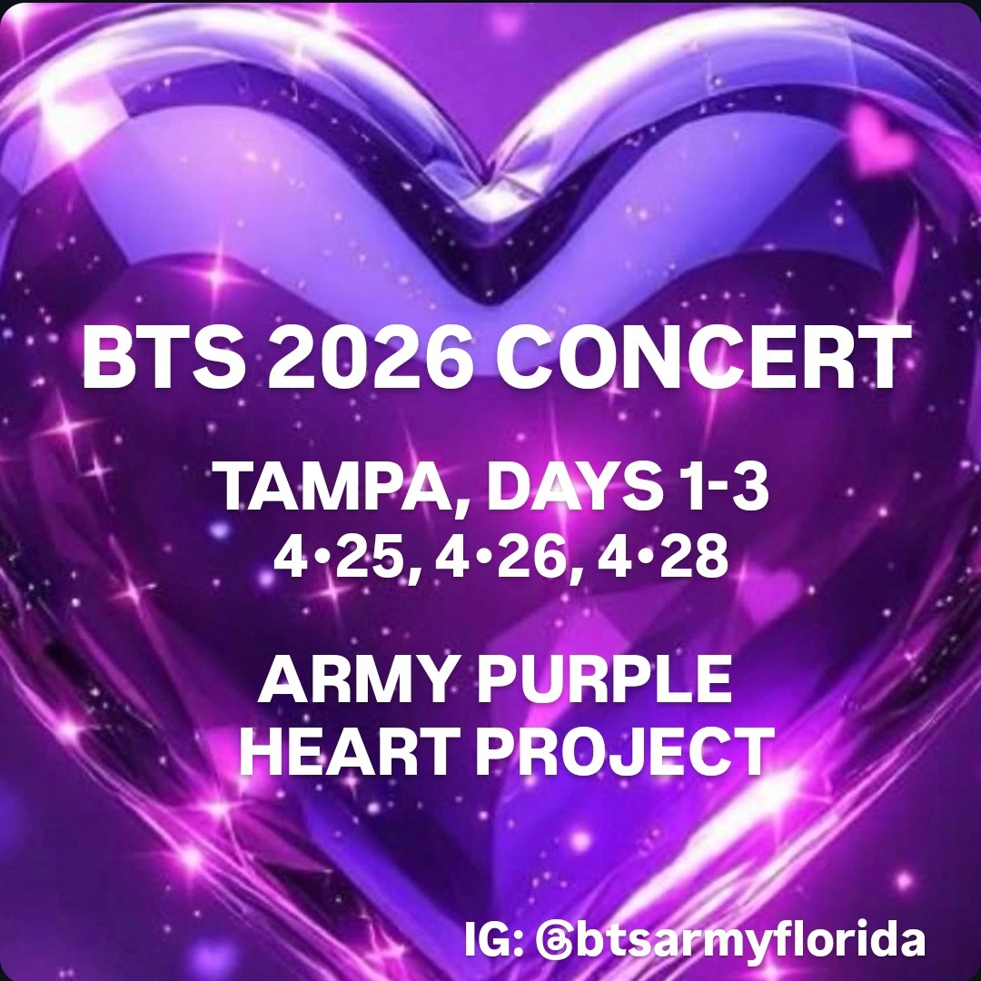 We need YOUR help! We would love to create a purple ocean for BTS when they kick off the North American leg of their 2026 Arirang tour in Tampa, Florida. During their first comments to Army, EVERYONE in the stadium will hold up their purple hearts. This small gesture will create a BIG visual impact for BTS. This is our way of communicating with them directly and immediately so they know that we want to say: