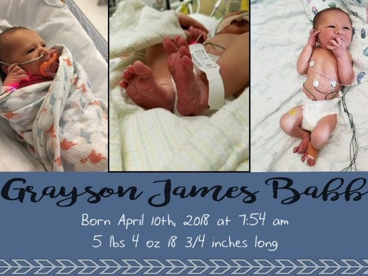 Grayson James Babb was born Tuesday, April 10, 2018 at 7:54 am in Pocatello, ID.  He weighted 5 lbs 4 oz and measured 18 3/4 inches long.  His parents were told he had a heart murmur. Two hours after his birth he was taken in for a echo cardiogram that lasted several hour. About 10 hours after his birth,  Grayson was being sedated and flown to Primary Children's Hospital in Salt Lake City Utah.