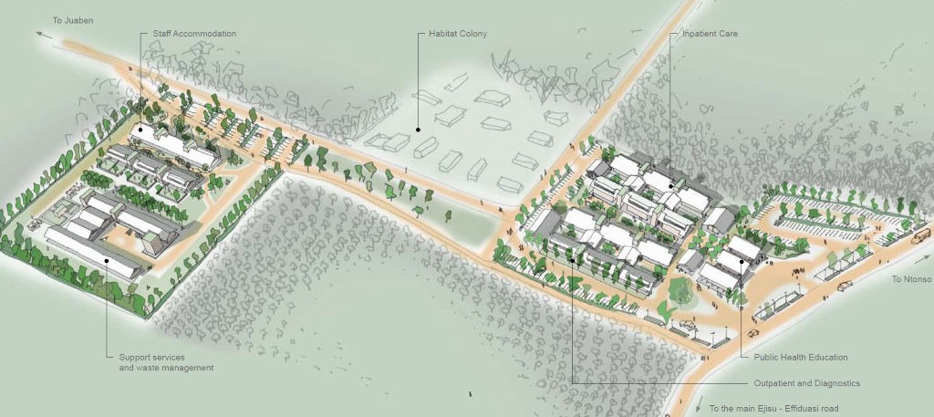 The hospital will sit on a 10-acre site - two pieces of land have been made available to BKLT for the development – one with a frontage off the main Ejisu to Effiduasi road, on the Ntonso road which lies on higher ground sloping to the south.