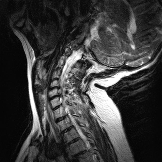 Eine craniocervikale Instabilität (CCI) der Halswirbelsäule, begleitet von Skoliose und fortgeschrittener Arthrose im Nackenbereich.