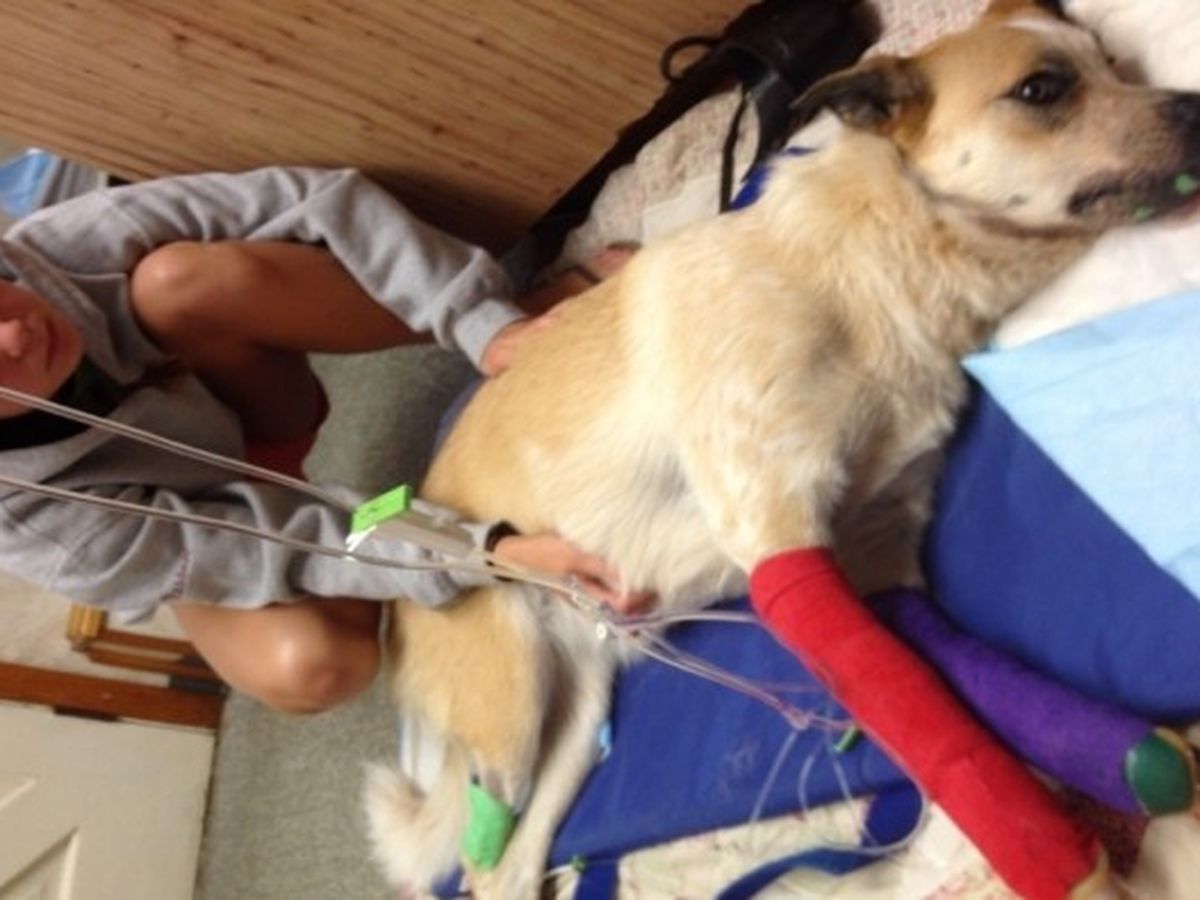 Kiki is a mutt from ASPCA, she was found on the streets of Tennessee at 4 months old. We adopted her when she was 6 months and she is now a year and a half old. Earlier today (June 13th) she nudged her way out the door. While I was looking for her I heard yelping near my house. She had been hit by a car. When I saw her she was trying to run away on her two front broken legs. Her jaw appeared broken and mangled, blood was pouring out of her mouth. She is almost out of critical condition. Her jaw, which appeared broken, was okay. But the skin had been torn off of her face and needs to be stitched back on. The break in her front legs were clean breaks across the ulna and radius. The bones had torn through her skin. She needs pins or plates in her front legs asap. It is about $7000 dollars to fix both of her legs. For the medications and services already provided, plus her skin being stitched back on it is $3000 dollars. Kiki is young and we have hope she will have a full recovery, but the cost of all this is very close to impossible without help. Any amount of money will help to save Kiki. She is a part of our family and we would all be wrecked without her. She whimpers whenever we leave for work and school and when we get back she follows us around everywhere. She was wagging her tail when we last saw her, and the next time we see her we hope she will be wagging her tail again.