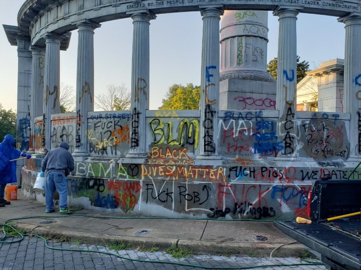 Examples of what we have cleaned to date include, but not limited to : Arthur Ashe (twice), Reconciliation Triangle statue and plaque, Evergreen Cemetery where Maggie Walker rests, Sidewalks, roads, walls, street signs, businesses, residences, monument pedestals such as Jefferson Davis (multiple times), Maury Fontaine (multiple times), Stonewall Jackson, Libby Hill soldiers and sailors monument (multiple times), Christopher Columbus, the water fountain behind the pedestal and many many more.