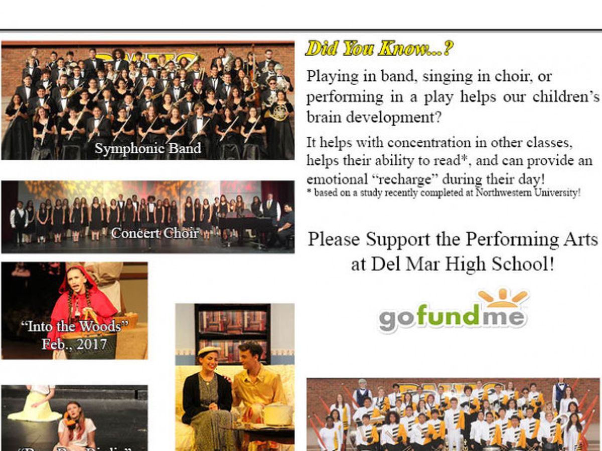 The Del Mar HS Performing Arts students are proud to be members of the only IB school in Campbell. Our music students regularly perform in local parades, Veterans Day and Memorial Day ceremonies, host an annual Band Review that draws particpants from all over California. Our theatre students create and perform a fall play, a winter musical and often a Shakespeare play in the Spring, in addition to performing at the annual CUHSD Theatre Fest.