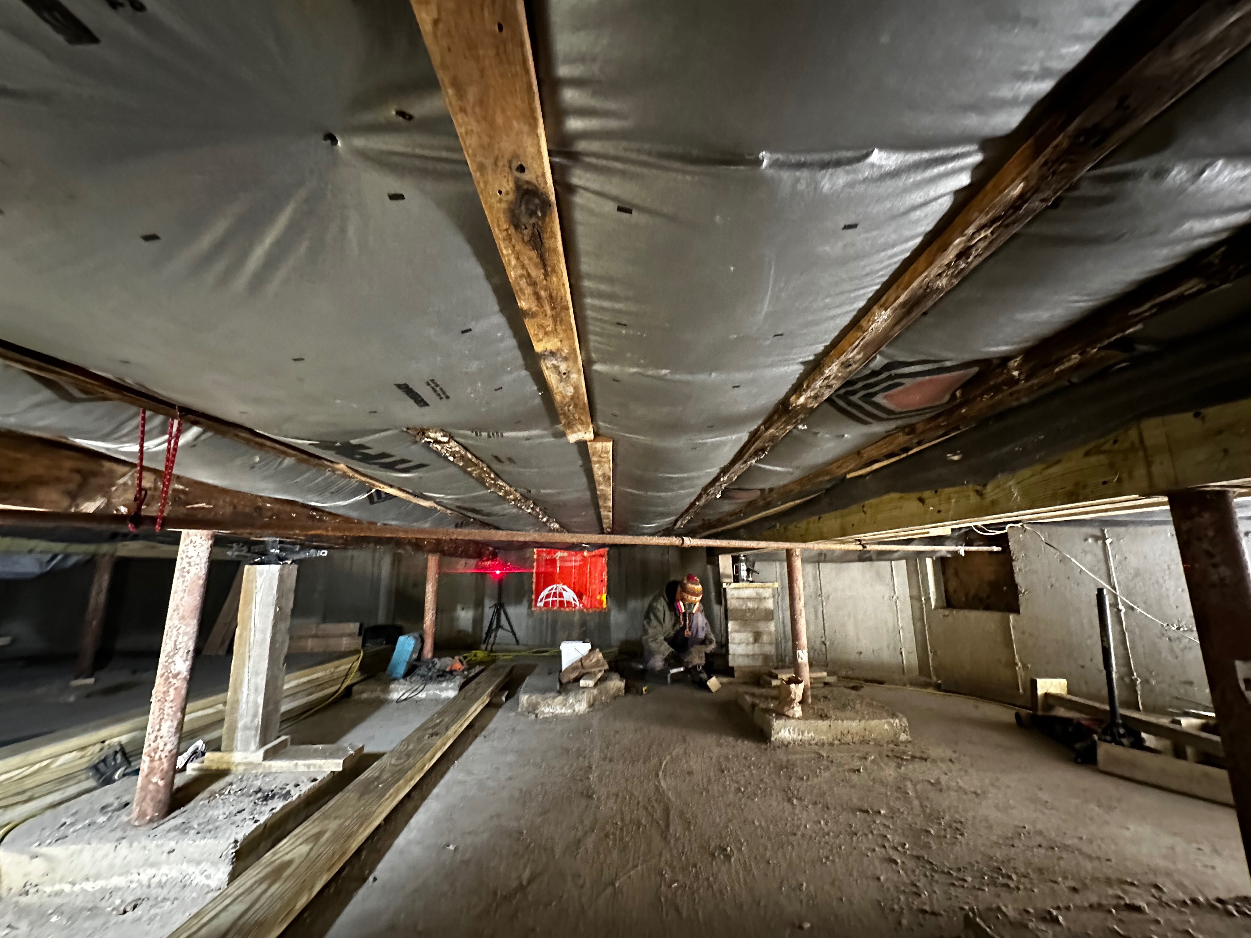 Laying down a 100’ x 100’ plastic moisture barrier to control dampness under the barn and prevent future decay