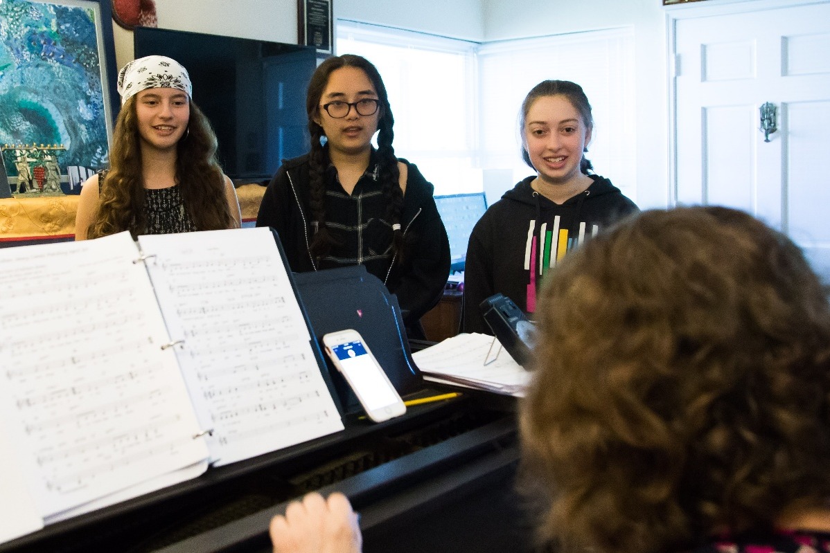 L to R: Lucia, Tai, Pippa, three middle school singers rehearsing, with Ellen at the piano.
