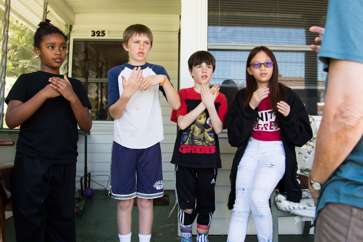 L to R: Dulari, Lewis, Stewart, and Jo, learning American Sign Language for the music video