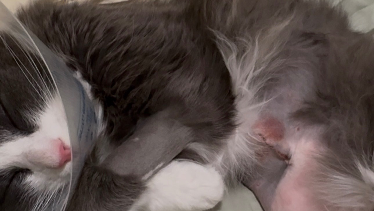 The first few days after surgery were especially intense. He needed medication every six hours and constant supervision. The medication made him drowsy, and he would try to move or climb and risk hurting himself. He also wears a cone to protect his stitches, but tries to remove it and can get stuck, so I cannot leave him alone.