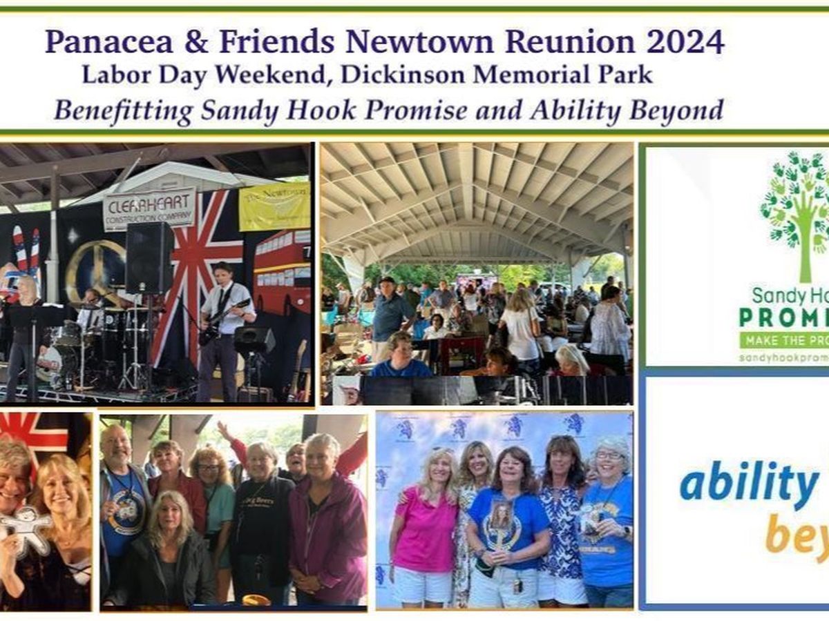 PANACEA band has hosted a free annual Panacea & Friends Reunion since reuniting for the 2013 "Great Newtown Reunion, a Day of Healing," in remembrance of those lost in the Sandy Hook Elementary School tragedy. While the 2023 concert was the final performance for Panacea (Corky Ballard, Leslie Ballard, Jon Dodson, Rick Kuhn, Bruce Tibbitts. 50+ years is a very good run!), so many NHS friends have requested we continue; it's an excellent way to reconnect with old friends, and with the Labor Day Parade on Main Street the next day, it's the perfect summer's end. So, a couple of us Panaceans decided, LET'S DO A NEWTOWN REUNION HOMECOMING FOR ALL NHS CLASSES, FRIENDS, AND FAMILIES THIS LABOR DAY WEEKEND!