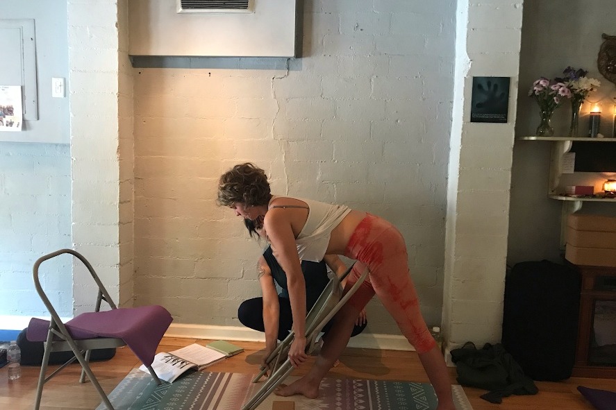 Above is a photo of me practicing ways we can adapt yoga postures with chairs to make poses more accessible to every body. This photo was taken before the Lyme Disease resurged in my body.