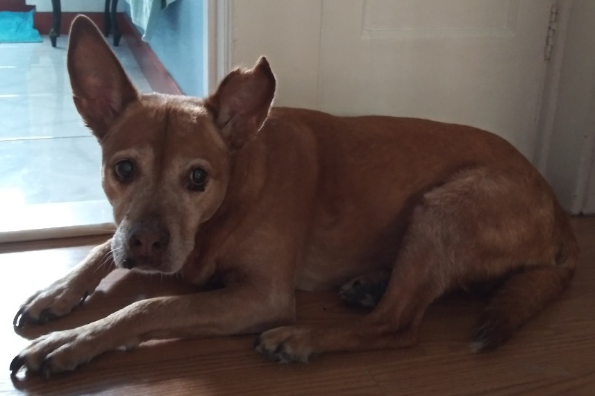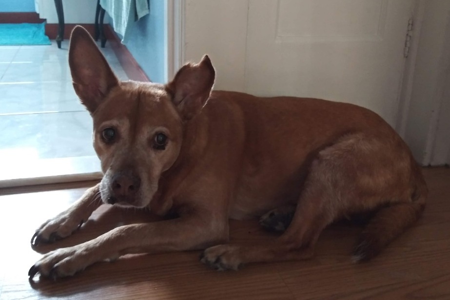 Cleo - rescued over 14 years ago when she was about a year old puppy running between cars during rush hour traffic. She's the watcher, the protector. With aging came loss of eyesight and hearing, limited mobility, anxiety, and dementia.