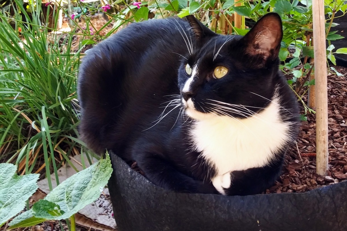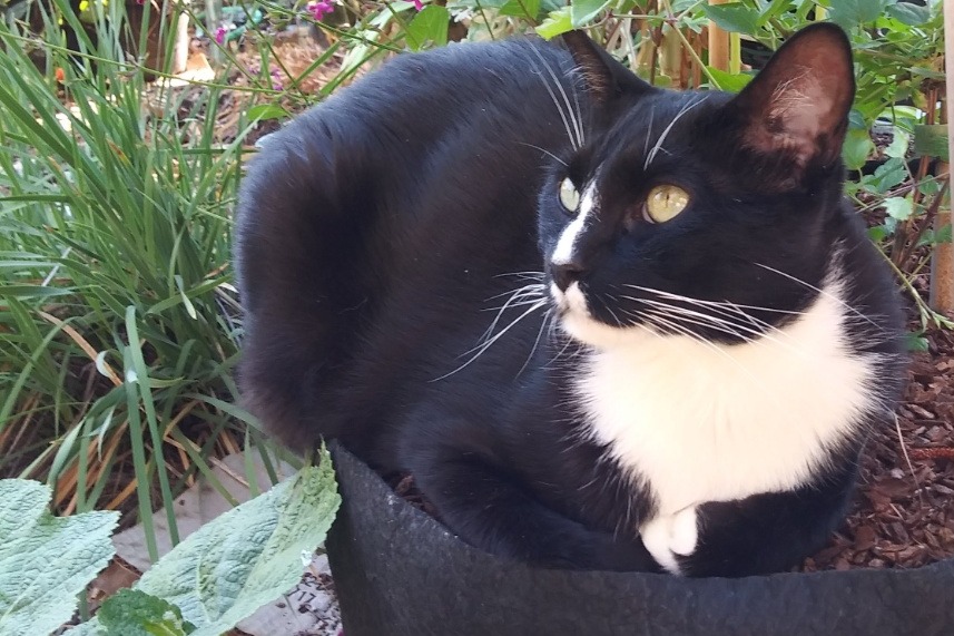 Felix - found me 3 years ago while gardening, when he was about a year old. He was shy but not fearful. He's the charmer. Previously adopted from a shelter, he spend the first year of his life 20 miles away, and somehow arrived in my neighborhood. When I found his previous humans, they couldn't take him back. He is an indoors-only cat now.