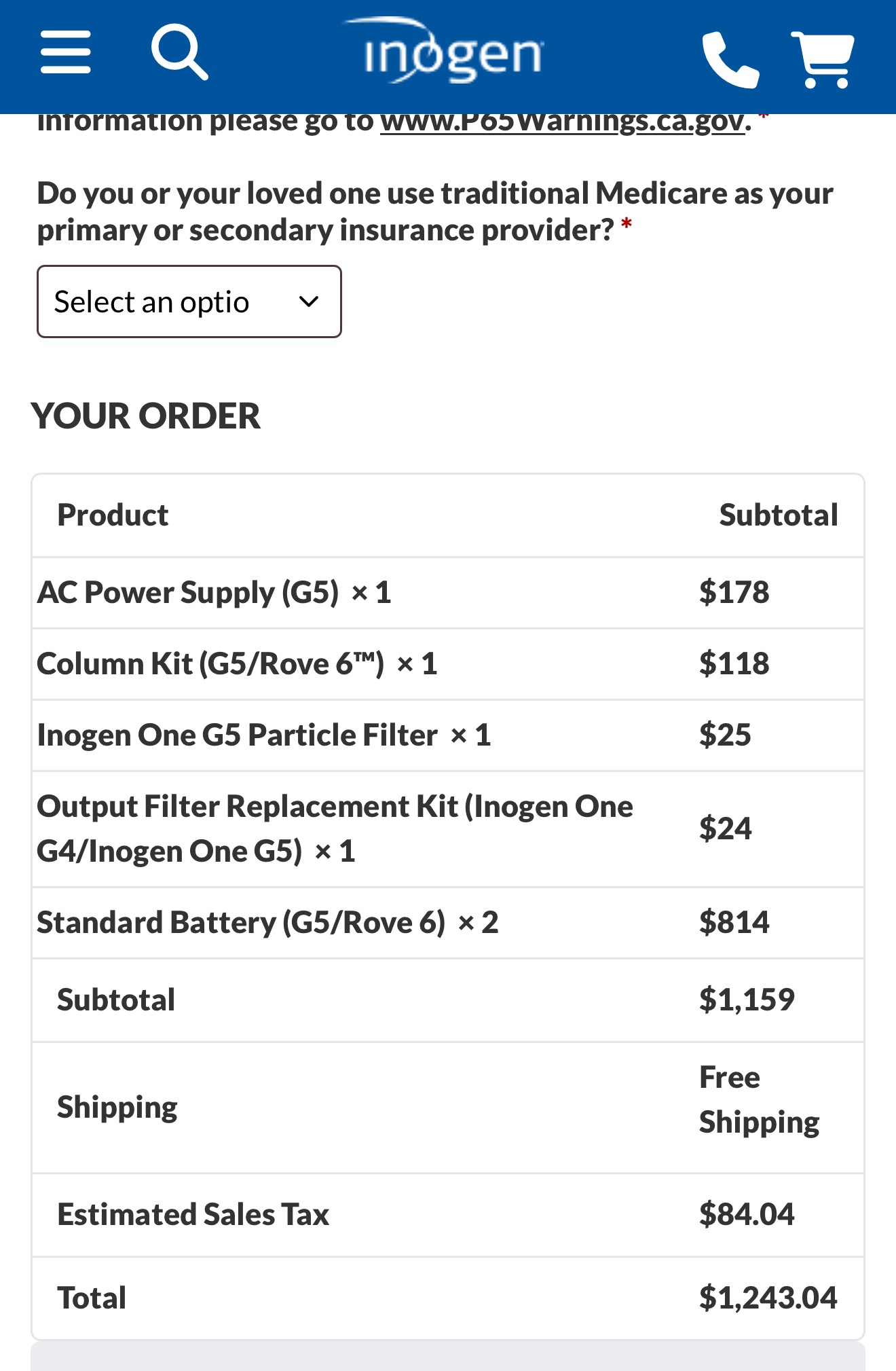 AC Power Supply (G5) × 1 $178 Column Kit (G5/Rove 6™) * 1 $118 Inogen One G5 Particle Filter × 1 $25