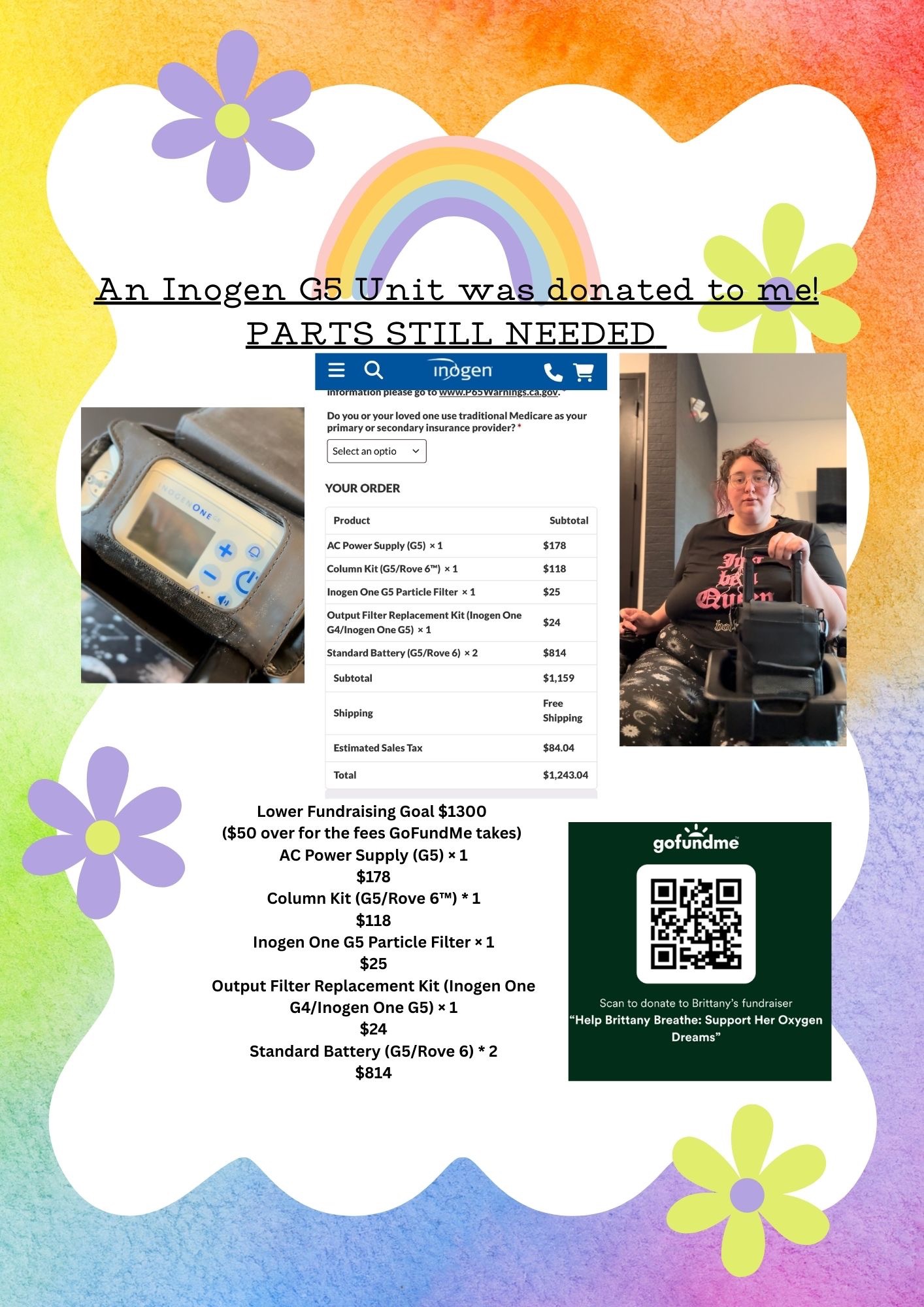 The portable oxygen concentrator system I have been donated is an INOGEN G5! The total needed is to raise now is $1,300. Please share this story, spread awareness and thank you for reading!