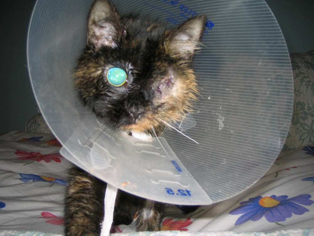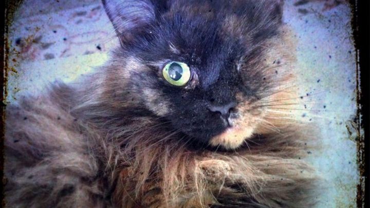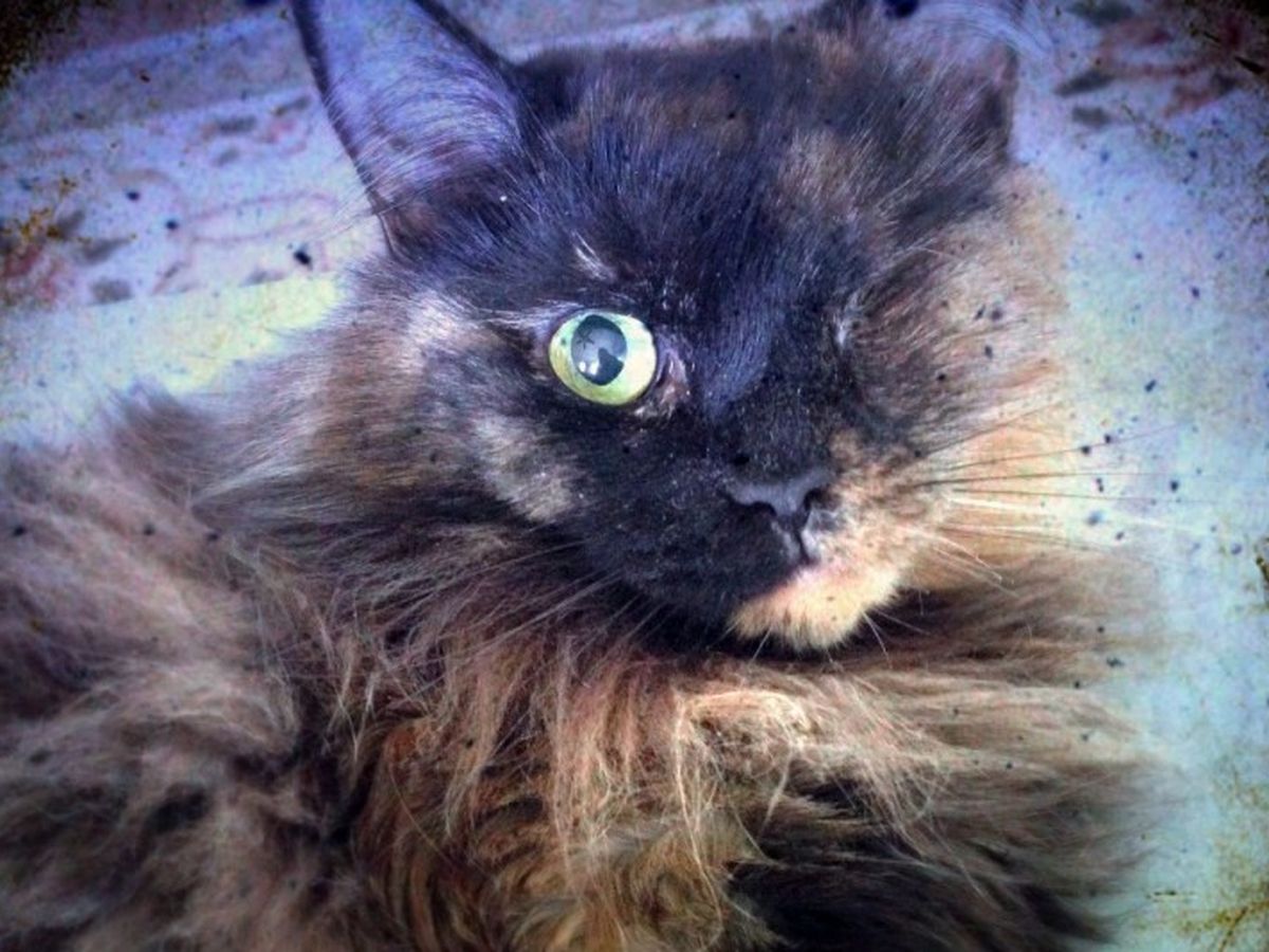 Three years ago someone walked into the veterinary office where I worked with a cat in a paper bag. She was emaciated, her ribs and hip bones poked through her long matted hair, and one eye was ruptured and hanging out of the socket. She didn't have the strength to lift her head or make a sound. I looked into the bag, it was love at first sight and I said, "That's my cat."