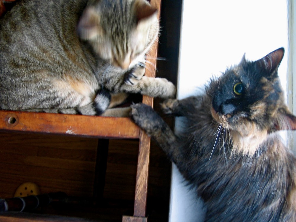 The vet on duty turned to me, "Don't get attached. I doubt she'll make it through the night." Two weeks later, she gained weight, the eye had been removed, and she was living with me. It's been a lovefest ever since. She ran to the door to meet me every night, like a puppy, a little Mae West hitch in her giddyup probably the result of some of the damage she'd sustained. She slept on my head like a mohawk, grooming my hair. She sat and watched me eat breakfast, followed me into the bathroom and watched me there, too. She drooled when she purred and all my shirts had little water stains where she lay her head and purred.