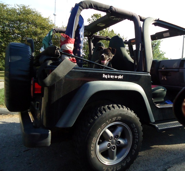 riding in the back of the jeep with the top off, (buckled in for safety) or in the car.