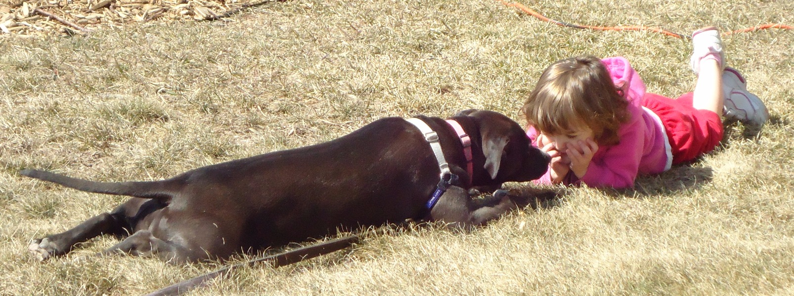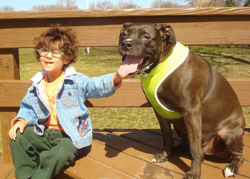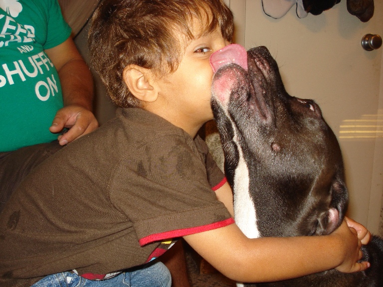 She outweighs him by probably 30 pounds, but she is so gentle and careful with him, it's a joy to watch.  She's gentle and careful with everyone, but he is very special to her; she knows his voice, and just goes nuts when he's around; she can't wait to see him and play with him!