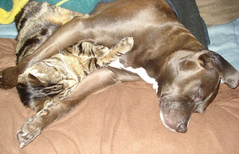 Zoey just nibbles gently on their fur with those very small front teeth, but she gets bit in the face by the cats, in the nose, and although they aren't drawing blood, those pointy little teeth are sharp!!  She gets kicked vigorously in the face with those back claws, but neither the dog nor the cats ever gets hurt.  They both absolutely LOVE to do this!  They clearly both "pull their punches", and no one ever gets so much as a scratch on them from playing that way.  After play, sleep!