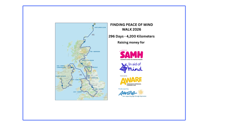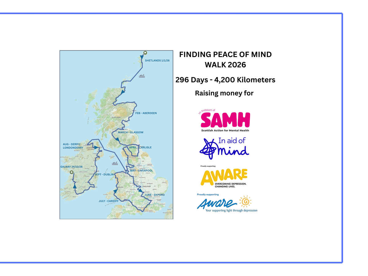 Mental health matters to all of us. I’m walking to raise awareness and funds for four incredible charities that provide vital mental-health support across the UK and Ireland:
