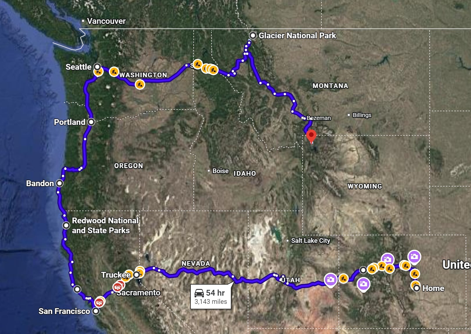 Travel from home to Truckee near Lake Tahoe, approximately 17 hours