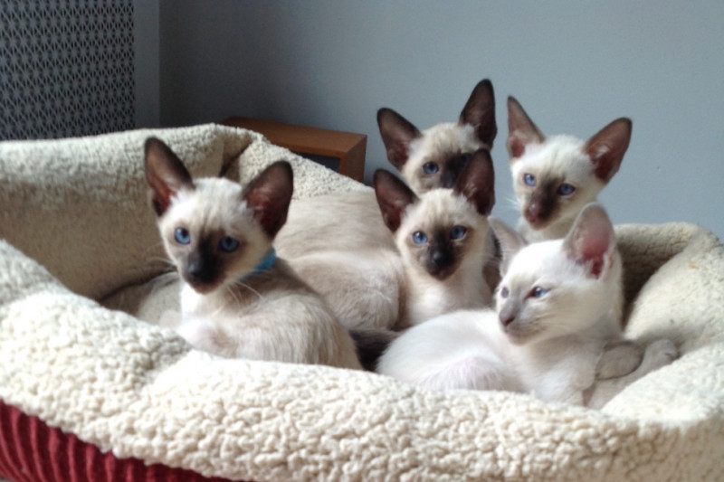 As you all know, Nancy has been through a terrible ordeal with 5 beautiful purebred Siamese kittens born in her apartment in January. Due to a bad batch of a very reputable cat food for mothers and kittens during the weaning period, all 6 of them became very ill with severe diarrhea a vomiting. Juliet, the mother, was the first to be hospitalized on IV for 3 days. Nancy had to syringe feed the kittens every two hours for a few days and then all 5 of them were hospitalized on IV for several days. The vets made it clear that they might not make it. Thanks to excellent veterinary care, and huge effort on Nancy's part, they all survived as you can see in the accompanying photo.