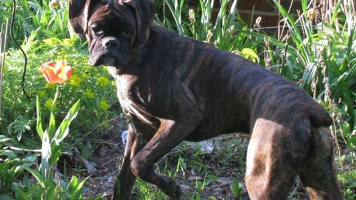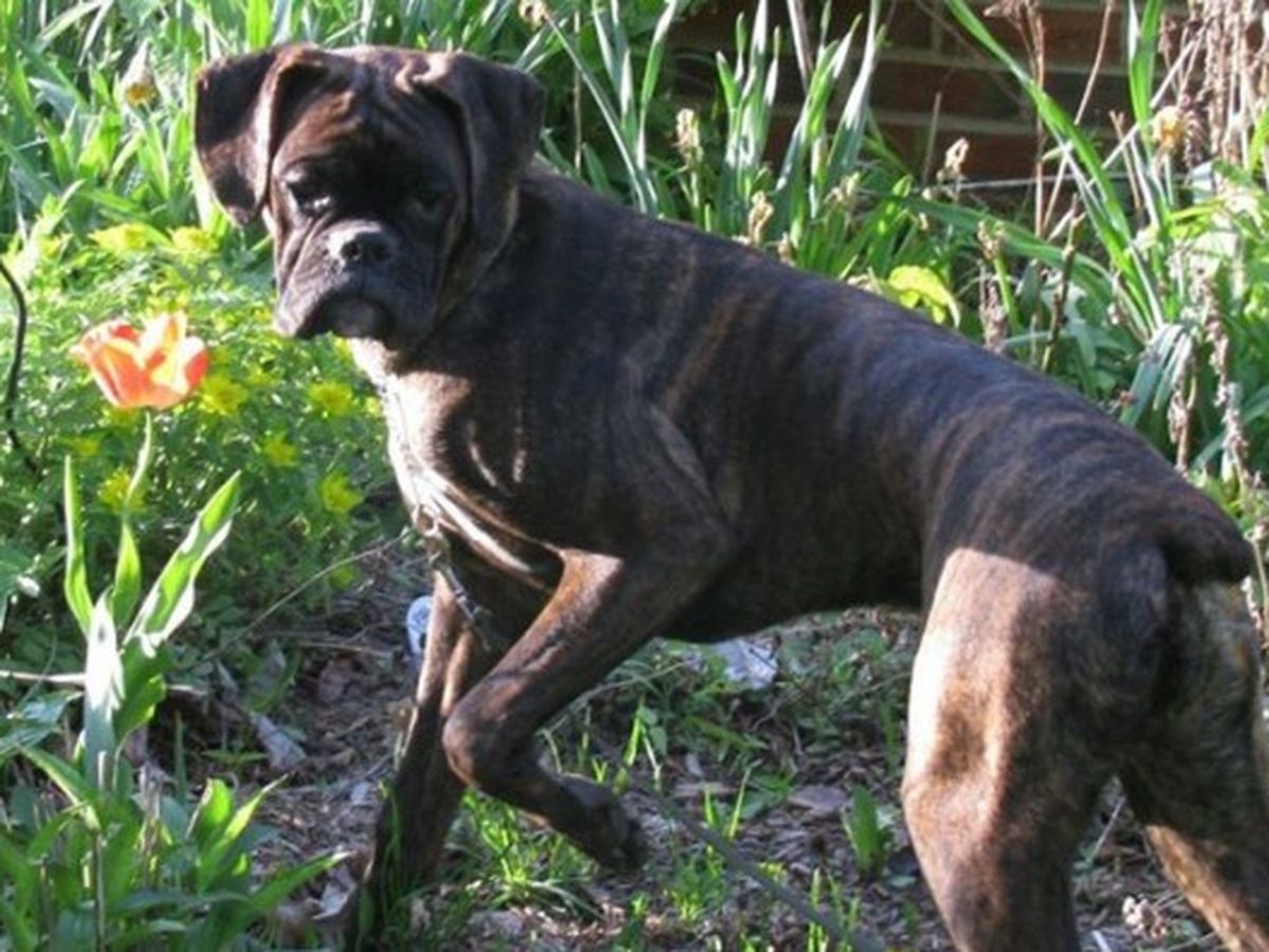 Hi, I am the lucky owner of this beautiful Boxer Kallie. I would like to tell you a little about her. Kallie just turned 2 and shouldn't even be here. On her dams X-ray before delivery, there were five puppies and a small blob the vet thought would be a dead pup. When the pups were born that blob came out yelling! A beautiful mahogany plain brindle girl. And what a fighter she was!