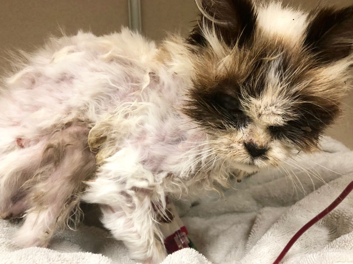 A wonderful woman name Barbara scooped her up and took her to a Veterinarian. The kitty's hair was so matted that she was almost unrecognizable and she was pure skin and bones. She had a mass of maggots that had begun to infiltrate her little body creating a wound. The Veterinarian said that if she had been brought in even one hour later, she would have died. One thing was for sure, this kitty had a strong will to live.