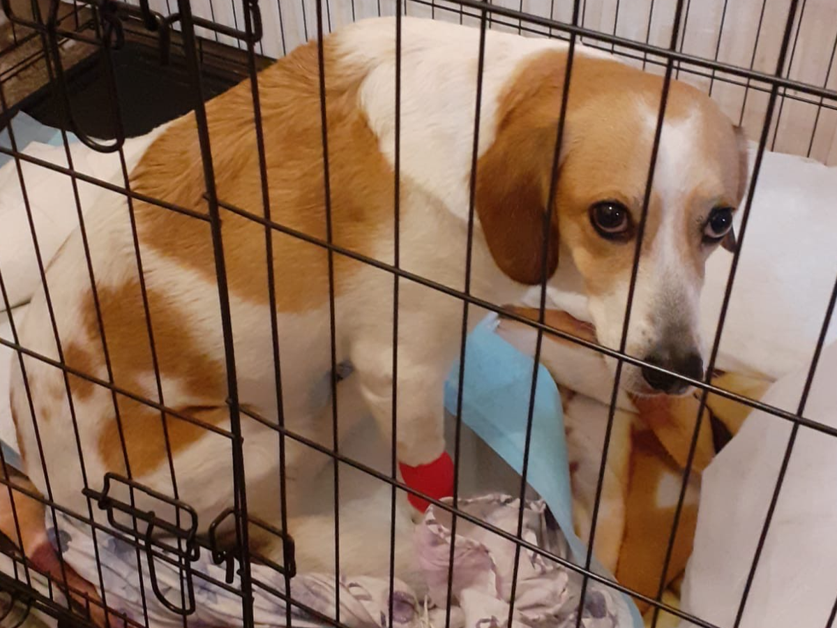 Unfortunately, due to an accident, Lila has torn both cruciate ligaments in her hind legs and has become paralyzed. Under the doctors' advice, she has to stay in a crate because, being a young dog, she instinctively tries to move and get restless.