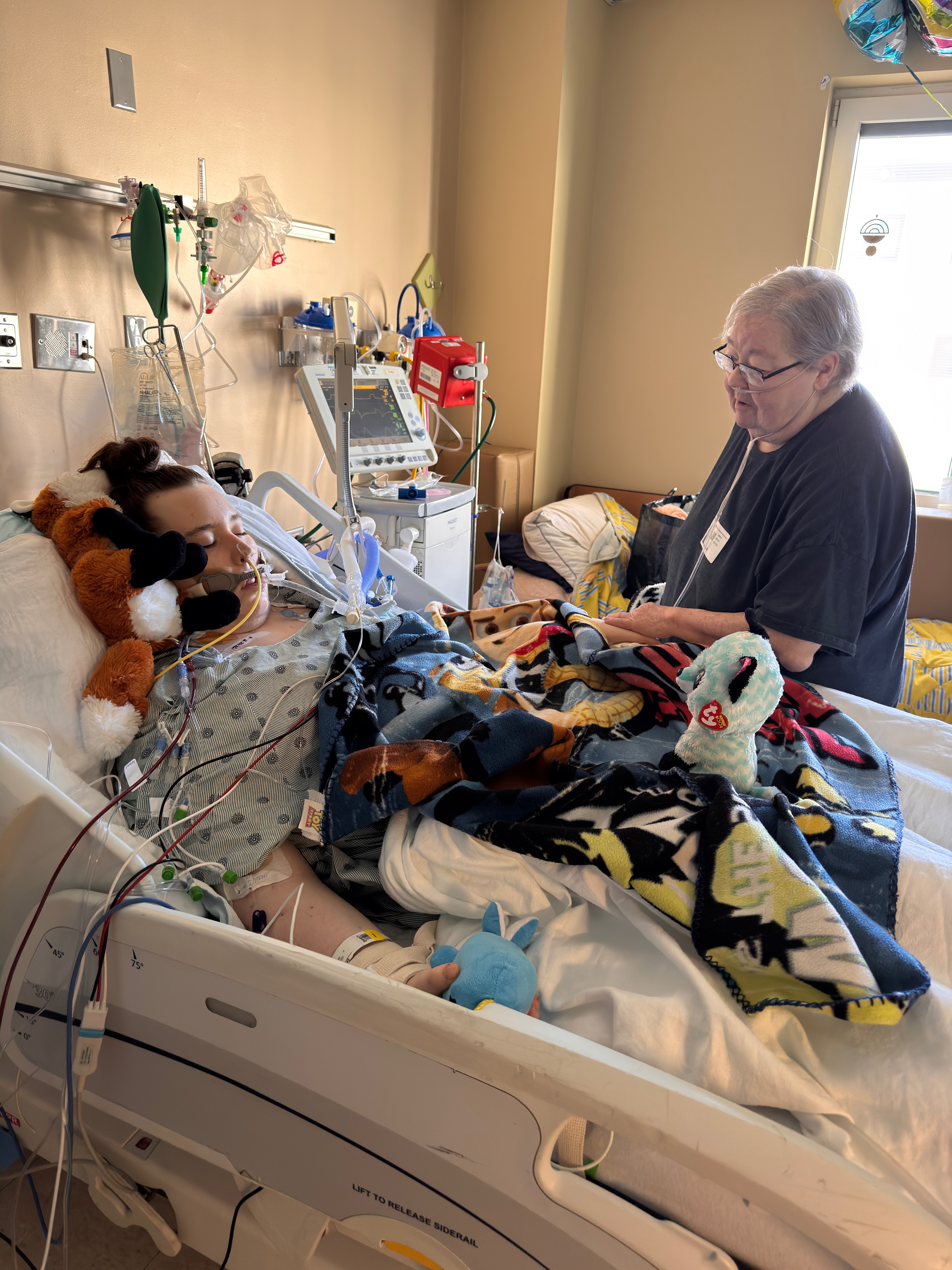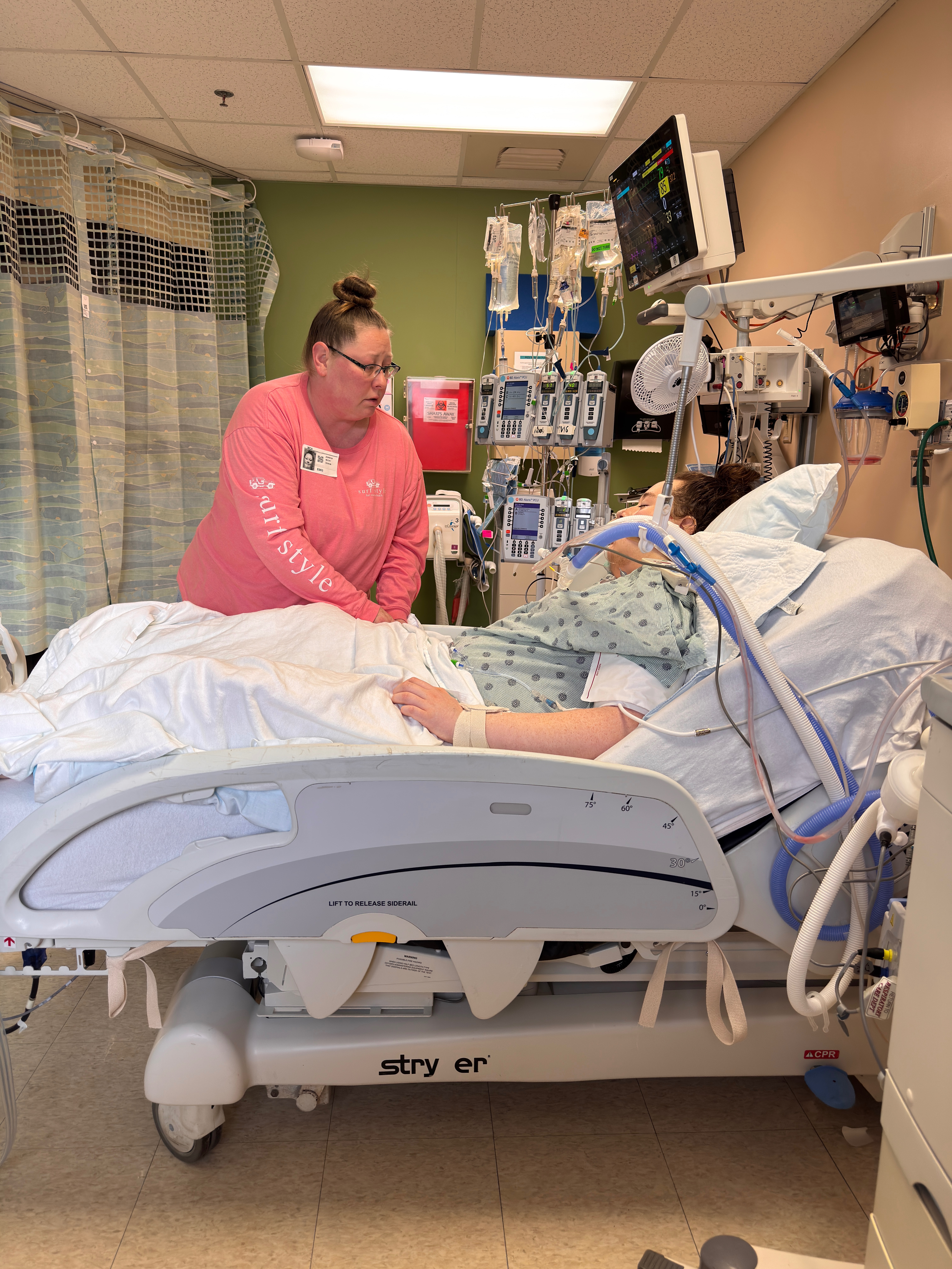 7am: His IV occluded again last night and it took 4 sticks and an ultrasound machine to get a new one. He also had a massive nose bleed out of both nostrils. (He has been having really bad nose bleeds for the last few years and his doctor just thinks it’s allergies). Thankfully a male respiratory therapist was out at the desk and followed a nurse into his room because his O2 tanked as Jen was trying to stop the bleeding. Jen is so tired and weak from lack of sleep it was taking all her strength to just pinch his nose. The respiratory therapist took over and seen him struggle with his breathing and then told the doctors he needed chest compression therapy.