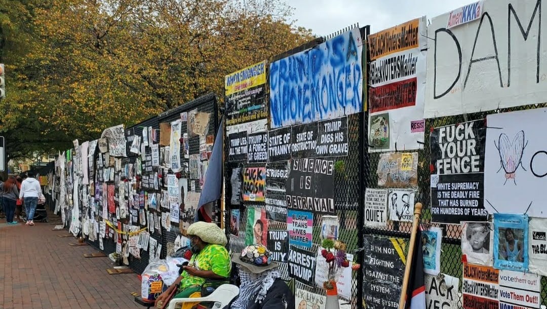 Nadine Seiler, took it upon herself to be the person, who would protect the fence, and she was joined by Karen Irwin and a small group of individuals, aided by the volunteers, of the William Thomas Anti-Nuclear Peace Vigil. The people holding space with it, were at risk every day from "Christian" tRump supporters; White supremacist militia groups; the city of D.C.; rain & wind, and the threatening whimsy of tRump.