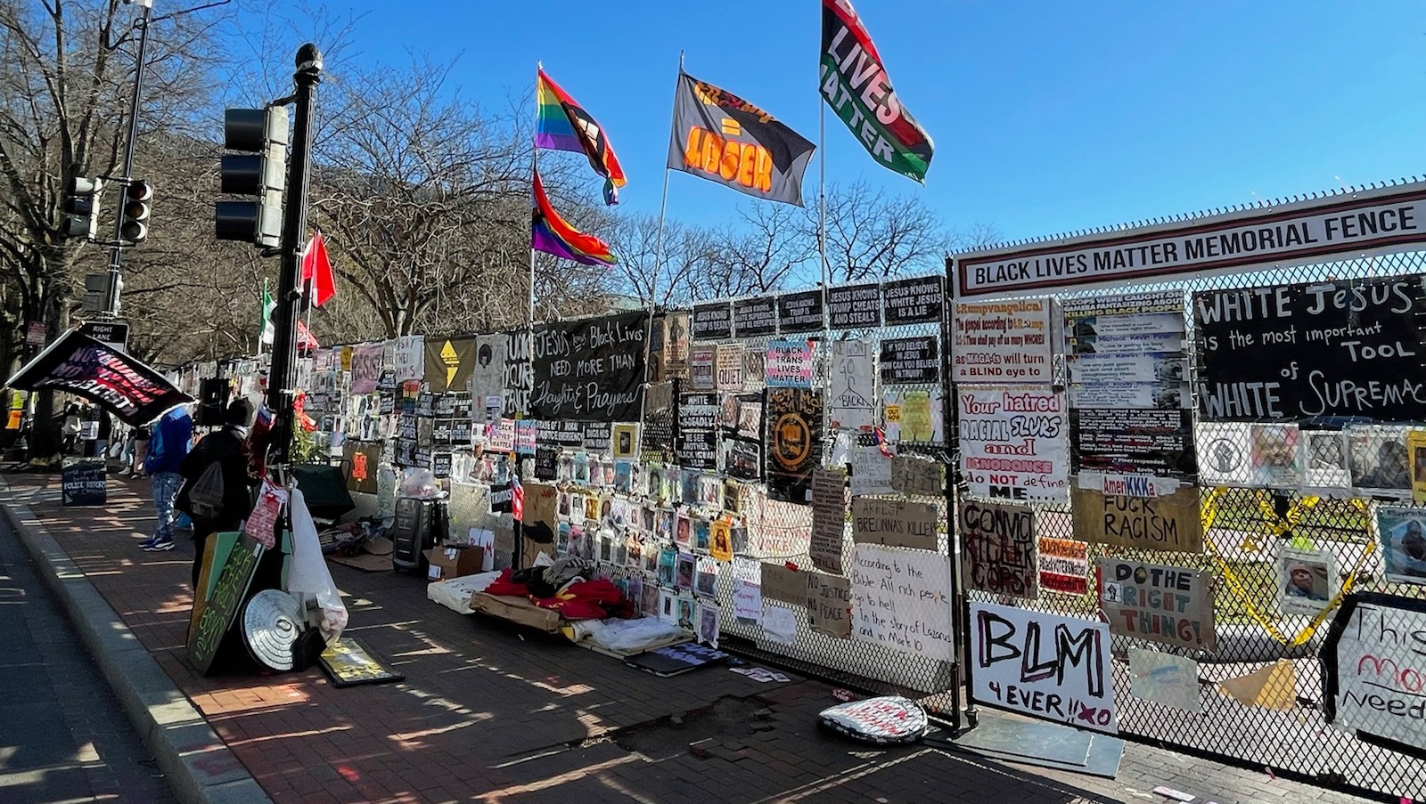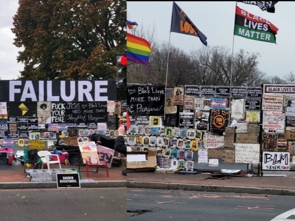 During closures of Lafayette Park, individuals would tend to the fence, ensuring the protest art and artifacts were rehung, after falling due to the elements and/or vandalism. On October, 26th, 2020 - it was made evident that the fence could not be left unattended because of the mass vandalism event, that took place that night.