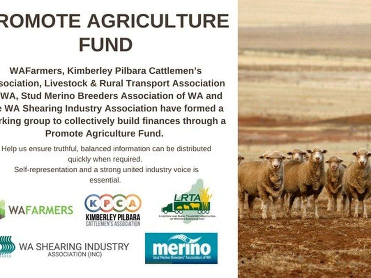 WAFarmers, Kimberley Pilbara Cattlemen’s Association, Livestock & Rural Transport Association of WA, Stud Merino Breeders Association of WA and the WA Shearing Industry Association have formed a working group to collectively build finances through a Promote Agriculture Fund, formally being promoted as the Industry Fighting Fund.