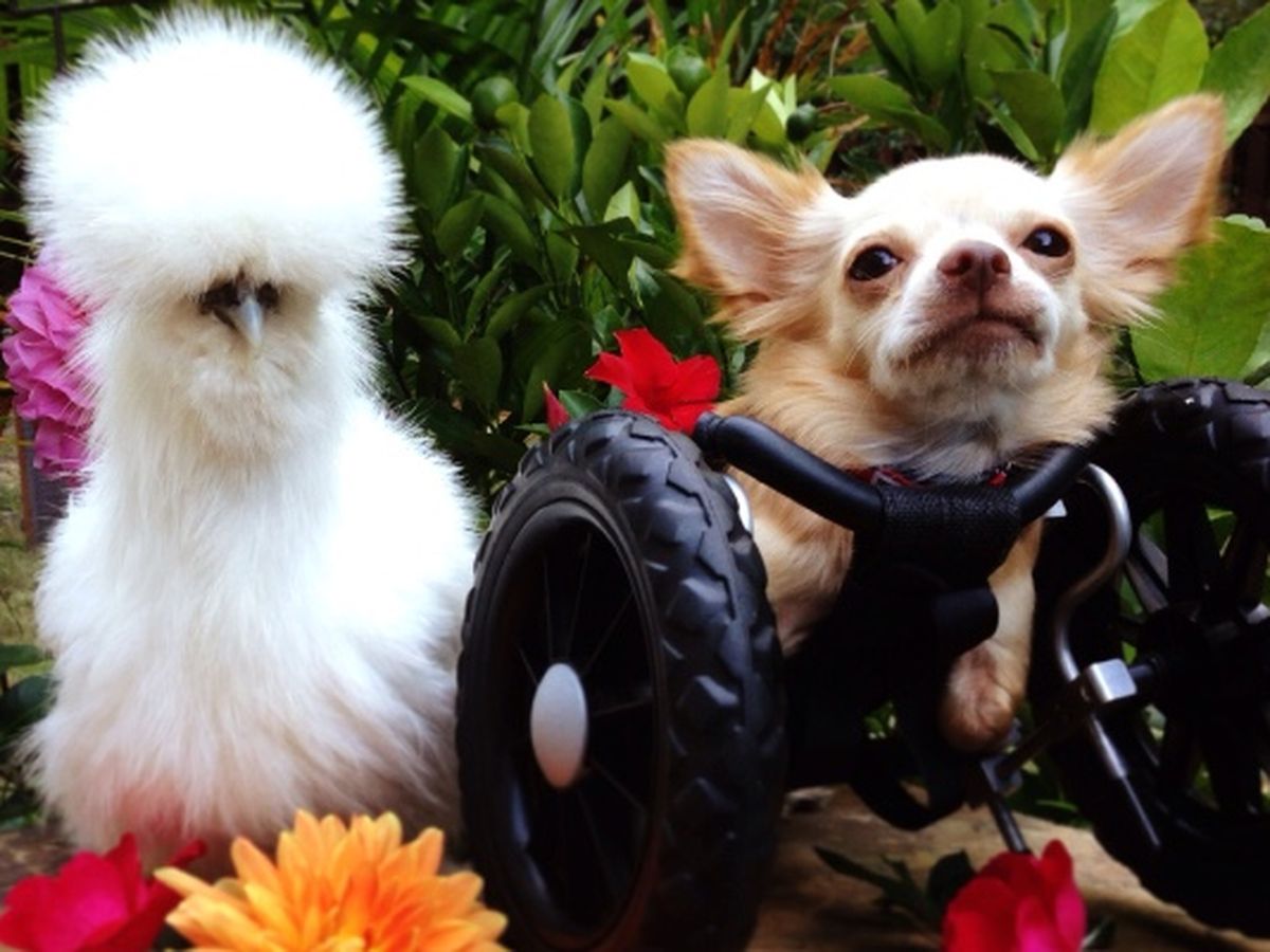 Roo the Chihuahua was born without front legs, and found abandoned in a park during winter. After being rescued, he and his best friend Penny the Chicken (who was previously rescued from a lab where she endured experiments) began "work" at an animal hospital, riding each day with their mom to be the hospital's pint-sized people greeters.