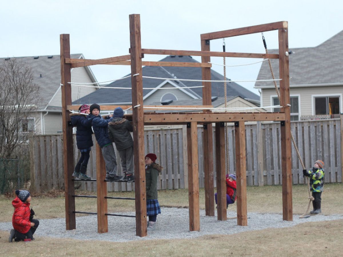 The playground illustration is shown in the picture. It is designed to be multifunctional while providing challenging and fun exercise all while improving their physical skills. The playground will include an 8-foot rock-climbing wall, 3 sets of monkey bars, two 12-foot climbing ropes, an 8-foot climbing net and other multifunction activities. It is designed for future attachments including one or more ziplines.