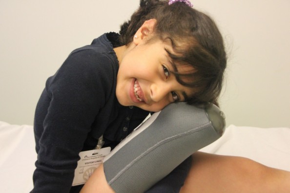 Little Hanan, 7, was injured in Syria when a bomb went through her house, and as a consequence suffered a right high trans-tibia traumatic amputation on September 23, 2013. Because of the lack of medical treatment in Syria, she was transported across the border to Jordan for medical treatment. Unfortunately, her parents were denied entry into Jordan, as Jordan did not want more refugees. As a result, little Hanan has been separated from her immediate family for the past 10 months. The necessary treatment was unfortunately not available in Jordan so she was flown to Chicago by PCRF after funding was secured for her at Lurie Children's Hospital for a prosthetic leg. When Hanan arrived in the US in mid-April she needed to learn to walk again as she had no crutches or therapy to speak of and hadn't walked since her trauma last September.